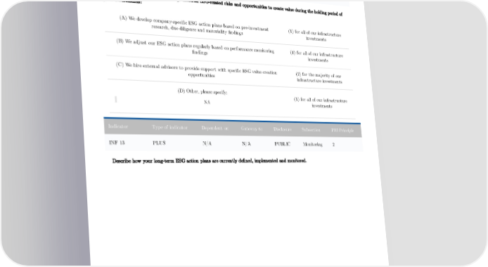 Indicator Type of indicator Dependent on Gateway to Disclosure Subsection PRI Principle INF 12 CORE N/A N/A PUBLIC Monitoring 1, 2 Post-investment, how do you manage material ESG-related risks and opportunities to create value during the holding period of your investments? (A) We develop company-specific ESG action plans based on pre-investment (1) for all of our infrastructure research, due diligence and materiality findings investments (B) We adjust our ESG action plans regularly based on performance monitoring (1) for all of our infrastructure findings investments (C) We hire external advisors to provide support with specific ESG value creation (2) for the majority of our opportunities infrastructure investments (D) Other, please specify: (1) for all of our infrastructure NA investments Indicator Type of indicator Dependent on Gateway to Disclosure Subsection PRI Principle INF 13 PLUS N/A N/A PUBLIC Monitoring 2 Describe how your long-term ESG action plans are currently defined, implemented and monitored. 148
