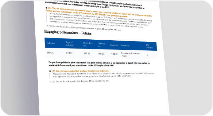 Indicator Type of indicator Dependent on Gateway to Disclosure Subsection PRI Principle ISP 23.2 CORE ISP 23 N/A PUBLIC Engaging policymakers 2 Do you have governance processes in place (e.g. board accountability and oversight, regular monitoring and review of relationships) that ensure your policy activities, including those through third parties, are aligned with your position on sustainable finance and your commitment to the 6 Principles of the PRI? ◉ (A) Yes, we have governance processes in place to ensure that our policy activities are aligned with our position on sustainable finance and our commitment to the 6 Principles of the PRI. Describe your governance processes: Allianz Global Investors is managed by our Executive Committee. With respect to all investment matters, the responsibility for ensuring our approach is designed to meet our obligations to our clients rests with the Investment Executive Committee, comprised of the firm’s senior investment leadership. The Compliance and Independent Enterprise Risk Management functions provide further governance oversight by regularly evaluating our processes and reviewing decisions to ensure that we have taken appropriate actions. ○ (B) No, we do not have these governance processes in place. Please explain why not: Engaging policymakers – Policies Type of Dependent Gateway PRI Indicator Disclosure Subsection indicator on to Principle Engaging policymakers – ISP 24 CORE ISP 23 ISP 24.1 PUBLIC 2 Policies Do you have policies in place that ensure that your political influence as an organisation is aligned with your position on sustainable finance and your commitment to the 6 Principles of the PRI? ◉ (A) Yes, we have a policy(ies) in place. Describe your policy(ies): Alignment with Sustainable Investment Team takes place in connection with all policy engagement activities, either before meetings with legislators and policymakers or when preparing written feedback, e.g. on public consultations ○ (B) No, we do not a policy(ies) in place. Please explain why not: 56