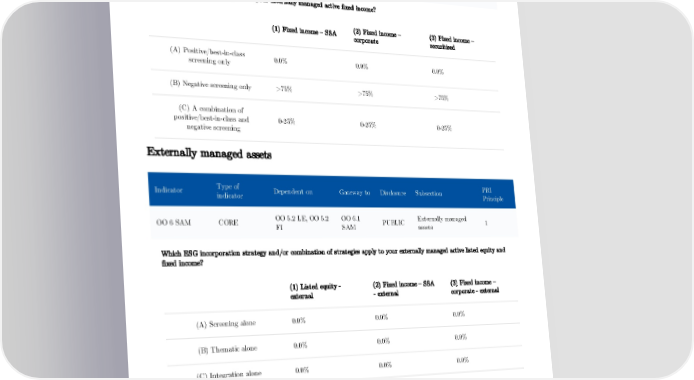 Indicator Type of indicator Dependent on Gateway to Disclosure Subsection PRI Principle OO 6.1 FI CORE OO 6 FI N/A PUBLIC Fixed income 1 What type of screening is applied to your internally managed active fixed income? (2) Fixed income – (3) Fixed income – (1) Fixed income – SSA corporate securitised (A) Positive/best-in-class 0.0% 0.0% 0.0% screening only (B) Negative screening only >75% >75% >75% (C) A combination of positive/best-in-class and 0-25% 0-25% 0-25% negative screening Externally managed assets Type of PRI Indicator Dependent on Gateway to Disclosure Subsection indicator Principle OO 5.2 LE, OO 5.2 OO 6.1 Externally managed OO 6 SAM CORE PUBLIC 1 FI SAM assets Which ESG incorporation strategy and/or combination of strategies apply to your externally managed active listed equity and fixed income? (1) Listed equity - (2) Fixed income – SSA (3) Fixed income – external - external corporate - external (A) Screening alone 0.0% 0.0% 0.0% (B) Thematic alone 0.0% 0.0% 0.0% (C) Integration alone 0.0% 0.0% 0.0% (D) Screening and integration 0.0% 0.0% 0.0% 16