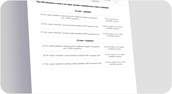 Type of Dependent Gateway PRI Indicator Disclosure Subsection indicator on to Principle Sharing ESG information with LE 14 CORE OO 10 N/A PUBLIC 6 stakeholders What ESG information is covered in your regular reporting to stakeholders such as clients or beneficiaries? (2) Active – quantitative (A) Our regular stakeholder reporting includes qualitative examples of engagement 3) In a minority of our and/or ESG incorporation stakeholder reporting 2) In the majority of our regular (B) Our regular stakeholder reporting includes quantitative ESG engagement data stakeholder reporting 2) In the majority of our regular (C) Our regular stakeholder reporting includes quantitative ESG incorporation data stakeholder reporting (3) Active – fundamental (A) Our regular stakeholder reporting includes qualitative examples of engagement 2) In the majority of our regular and/or ESG incorporation stakeholder reporting 2) In the majority of our regular (B) Our regular stakeholder reporting includes quantitative ESG engagement data stakeholder reporting 2) In the majority of our regular (C) Our regular stakeholder reporting includes quantitative ESG incorporation data stakeholder reporting 112