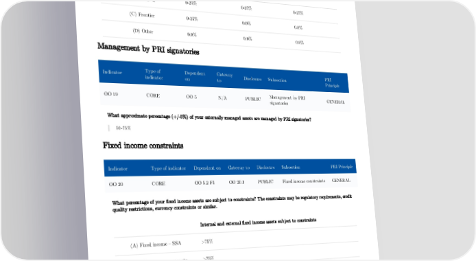 (5) Fixed income – (6) Private equity (8) Infrastructure private debt (A) Developed >75% >75% >75% (B) Emerging 0-25% 0-25% 0-25% (C) Frontier 0-25% 0.0% 0.0% (D) Other 0.0% 0.0% 0.0% Management by PRI signatories Type of Dependent Gateway PRI Indicator Disclosure Subsection indicator on to Principle Management by PRI OO 19 CORE OO 5 N/A PUBLIC GENERAL signatories What approximate percentage (+/-5%) of your externally managed assets are managed by PRI signatories? 50-75% Fixed income constraints Indicator Type of indicator Dependent on Gateway to Disclosure Subsection PRI Principle OO 20 CORE OO 5.2 FI OO 20.1 PUBLIC Fixed income constraints GENERAL What percentage of your fixed income assets are subject to constraints? The constraints may be regulatory requirements, credit quality restrictions, currency constraints or similar. Internal and external fixed income assets subject to constraints (A) Fixed income – SSA >75% (B) Fixed income – corporate >75% 29