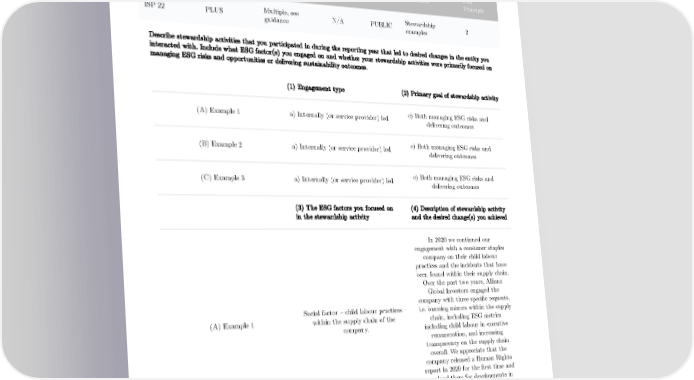 Stewardship examples Type of Gateway PRI Indicator Dependent on Disclosure Subsection indicator to Principle Multiple, see Stewardship ISP 22 PLUS N/A PUBLIC 2 guidance examples Describe stewardship activities that you participated in during the reporting year that led to desired changes in the entity you interacted with. Include what ESG factor(s) you engaged on and whether your stewardship activities were primarily focused on managing ESG risks and opportunities or delivering sustainability outcomes. (1) Engagement type (2) Primary goal of stewardship activity c) Both managing ESG risks and (A) Example 1 a) Internally (or service provider) led delivering outcomes c) Both managing ESG risks and (B) Example 2 a) Internally (or service provider) led delivering outcomes c) Both managing ESG risks and (C) Example 3 a) Internally (or service provider) led delivering outcomes (3) The ESG factors you focused on (4) Description of stewardship activity in the stewardship activity and the desired change(s) you achieved In 2020 we continued our engagement with a consumer staples company on their child labour practices and the incidents that have been found within their supply chain. Over the past two years, Allianz Global Investors engaged the company with three specific requests, Social factor – child labour practices i.e. banning minors within the supply (A) Example 1 within the supply chain of the chain, including ESG metrics company. including child labour in executive remuneration, and increasing transparency on the supply chain overall. We appreciate that the company released a Human Rights report in 2020 for the first time and applaud them for developments in their data disclosure, but would like to see additional improvements. 53