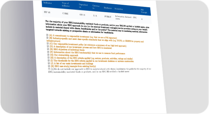 Transparency & Confidence-Building Measures Information disclosed – ESG assets Type of Dependent Gateway PRI Indicator Disclosure Subsection indicator on to Principle Information disclosed – ESG ISP 46 CORE OO 16 N/A PUBLIC 6 assets For the majority of your ESG/sustainability marketed funds or products, and/or your ESG/RI certified or labelled assets, what information about your ESG approach do you (or the external investment managers/service providers acting on your behalf) include in material shared with clients, beneficiaries and/or the public? The material may be marketing material, information targeted towards existing or prospective clients or information for beneficiaries. ☑ (A) A commitment to responsible investment (e.g. that we are a PRI signatory) ☑ (B) Industry-specific and asset class–specific standards that we align with (e.g. TCFD, or GRESB for property and infrastructure) ☑ (C) Our responsible investment policy (at minimum a summary of our high-level approach) ☑ (D) A description of our investment process and how ESG is considered ☑ (E) ESG objectives of individual funds ☑ (F) Information about the ESG benchmark(s) that we use to measure fund performance ☑ (G) Our stewardship approach ☑ (H) A description of the ESG criteria applied (e.g. sectors, products, activities, ratings and similar) ☑ (I) The thresholds for the ESG criteria applied in our investment decisions or universe construction ☑ (J) A list of our main investments and holdings ☑ (K) ESG case study/example from existing fund(s) ☐ (L)We do not include our approach to ESG in material shared with clients/beneficiaries/the public for the majority of our ESG/sustainability marketed funds or products, and/or our ESG/RI certified or labelled assets 76