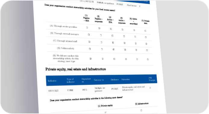 Fixed income Indicator Type of indicator Dependent on Gateway to Disclosure Subsection PRI Principle OO 9 FI CORE OO 5, OO 5.2 FI Multiple, see guidance PUBLIC Fixed income 2 Does your organisation conduct stewardship activities for your fixed income assets? (1) (2) (4) (5) (6) Active (7) Private Passive Passive – Active – Active – – debt – SSA corporate SSA corporate securitised (A) Through service providers ☐ ☐ ☐ ☐ ☐ ☐ (B) Through external managers ☐ ☐ ☐ ☐ ☐ ☐ (C) Through internal staff ☐ ☐ ☑ ☑ ☑ ☑ (D) Collaboratively ☐ ☐ ☑ ☑ ☑ ☐ (E) We did not conduct this stewardship activity for this ☑ ☑ ☐ ☐ ☐ ☐ strategy/asset type Private equity, real estate and infrastructure Type of Dependent PRI Indicator Gateway to Disclosure Subsection indicator on Principle Multiple, see Private equity, real estate and OO 9 ALT CORE OO 5 PUBLIC 2 guidance infrastructure Does your organisation conduct stewardship activities in the following asset classes? (1) Private equity (3) Infrastructure (A) Through service providers ☐ ☐ (B) Through external managers ☐ ☐ 20