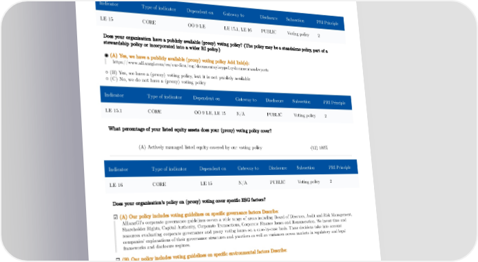 Stewardship Voting policy Indicator Type of indicator Dependent on Gateway to Disclosure Subsection PRI Principle LE 15 CORE OO 9 LE LE 15.1, LE 16 PUBLIC Voting policy 2 Does your organisation have a publicly available (proxy) voting policy? (The policy may be a standalone policy, part of a stewardship policy or incorporated into a wider RI policy.) ◉ (A) Yes, we have a publicly available (proxy) voting policy Add link(s): https://www.allianzgi.com/en/our-firm/esg/documents#keypolicydocumentsandreports ○ (B) Yes, we have a (proxy) voting policy, but it is not publicly available ○ (C) No, we do not have a (proxy) voting policy Indicator Type of indicator Dependent on Gateway to Disclosure Subsection PRI Principle LE 15.1 CORE OO 9 LE, LE 15 N/A PUBLIC Voting policy 2 What percentage of your listed equity assets does your (proxy) voting policy cover? (A) Actively managed listed equity covered by our voting policy (12) 100% Indicator Type of indicator Dependent on Gateway to Disclosure Subsection PRI Principle LE 16 CORE LE 15 N/A PUBLIC Voting policy 2 Does your organisation's policy on (proxy) voting cover specific ESG factors? ☑ (A) Our policy includes voting guidelines on specific governance factors Describe: AllianzGI’s corporate governance guidelines covers a wide range of areas including Board of Directors, Audit and Risk Management, Shareholder Rights, Capital Authority, Corporate Transactions, Corporate Finance Issues and Remuneration. We invest time and resources evaluating corporate governance and proxy voting issues on a case-by-case basis. These decisions take into account companies’ explanations of their governance structures and practices as well as variances across markets in regulatory and legal frameworks and disclosure regimes. ☑ (B) Our policy includes voting guidelines on specific environmental factors Describe: 113