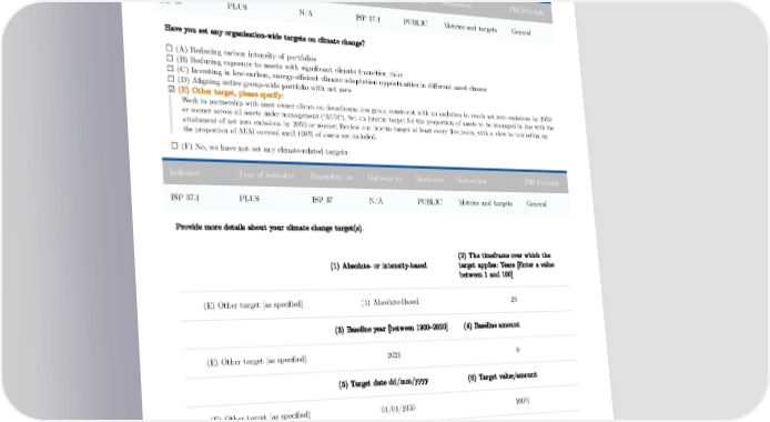 ☑ (H) Processes for identifying, assessing and managing climate-related risks are not integrated into our overall risk management Metrics and targets Indicator Type of indicator Dependent on Gateway to Disclosure Subsection PRI Principle ISP 37 PLUS N/A ISP 37.1 PUBLIC Metrics and targets General Have you set any organisation-wide targets on climate change? ☐ (A) Reducing carbon intensity of portfolios ☐ (B) Reducing exposure to assets with significant climate transition risks ☐ (C) Investing in low-carbon, energy-efficient climate adaptation opportunities in different asset classes ☐ (D) Aligning entire group-wide portfolio with net zero ☑ (E) Other target, please specify: Work in partnership with asset owner clients on decarbonisation goals, consistent with an ambition to reach net zero emissions by 2050 or sooner across all assets under management (‘AUM’); Set an interim target for the proportion of assets to be managed in line with the attainment of net zero emissions by 2050 or sooner; Review our interim target at least every five years, with a view to ratcheting up the proportion of AUM covered until 100% of assets are included. ☐ (F) No, we have not set any climate-related targets Indicator Type of indicator Dependent on Gateway to Disclosure Subsection PRI Principle ISP 37.1 PLUS ISP 37 N/A PUBLIC Metrics and targets General Provide more details about your climate change target(s). (2) The timeframe over which the (1) Absolute- or intensity-based target applies: Years [Enter a value between 1 and 100] (E) Other target [as specified] (1) Absolute-Based 29 (3) Baseline year [between 1900–2020] (4) Baseline amount (E) Other target [as specified] 2021 0 (5) Target date dd/mm/yyyy (6) Target value/amount (E) Other target [as specified] 01/01/2050 100% 67