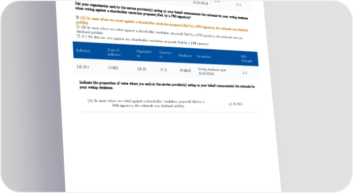 Type of Dependent Gateway PRI Indicator Disclosure Subsection indicator on to Principle Voting disclosure post LE 23 CORE OO 9 LE LE 23.1 PUBLIC 2, 5 AGM/EGM Did your organisation and/or the service provider(s) acting on your behalf communicate the rationale for your voting decisions when voting against a shareholder resolution proposed/filed by a PRI signatory? ☑ (A) In cases where we voted against a shareholder resolution proposed/filed by a PRI signatory, the rationale was disclosed publicly ☐ (B) In cases where we voted against a shareholder resolution proposed/filed by a PRI signatory, the rationale was not disclosed publicly ☐ (C) We did not vote against any shareholder resolution proposed/filed by a PRI signatory Type of Dependent Gateway PRI Indicator Disclosure Subsection indicator on to Principle Voting disclosure post LE 23.1 CORE LE 23 N/A PUBLIC 2, 5 AGM/EGM Indicate the proportion of votes where you and/or the service provider(s) acting on your behalf communicated the rationale for your voting decisions. (A) In cases where we voted against a shareholder resolution proposed/filed by a (4) 76–95% PRI signatory, the rationale was disclosed publicly 118