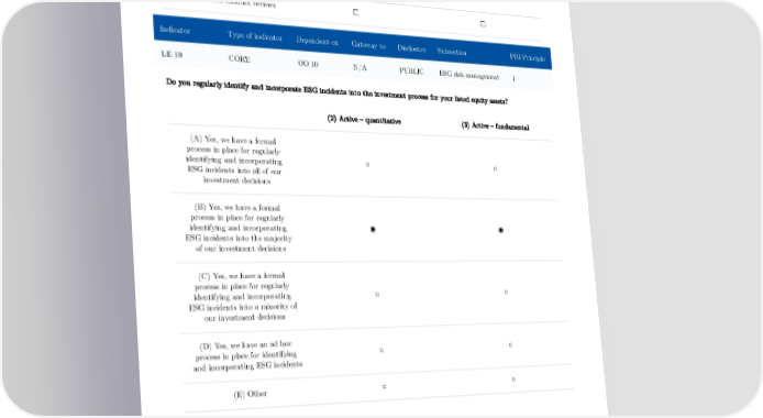 (D) We do not conduct regular reviews. Risk reviews of ESG factors are conducted at the ☐ ☐ discretion of the individual fund manager and vary in frequency (E) We do not conduct reviews ☐ ☐ Indicator Type of indicator Dependent on Gateway to Disclosure Subsection PRI Principle LE 10 CORE OO 10 N/A PUBLIC ESG risk management 1 Do you regularly identify and incorporate ESG incidents into the investment process for your listed equity assets? (2) Active – quantitative (3) Active – fundamental (A) Yes, we have a formal process in place for regularly identifying and incorporating ○ ○ ESG incidents into all of our investment decisions (B) Yes, we have a formal process in place for regularly identifying and incorporating ◉ ◉ ESG incidents into the majority of our investment decisions (C) Yes, we have a formal process in place for regularly identifying and incorporating ○ ○ ESG incidents into a minority of our investment decisions (D) Yes, we have an ad hoc process in place for identifying ○ ○ and incorporating ESG incidents (E) Other ○ ○ 110