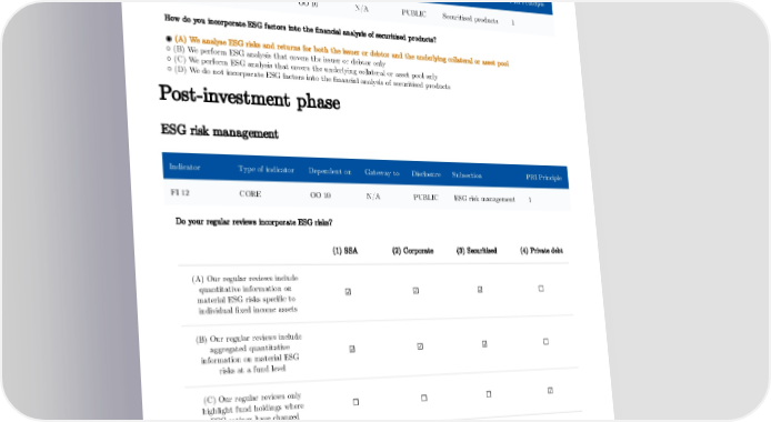 Securitised products Indicator Type of indicator Dependent on Gateway to Disclosure Subsection PRI Principle FI 11 CORE OO 10 N/A PUBLIC Securitised products 1 How do you incorporate ESG factors into the financial analysis of securitised products? ◉ (A) We analyse ESG risks and returns for both the issuer or debtor and the underlying collateral or asset pool ○ (B) We perform ESG analysis that covers the issuer or debtor only ○ (C) We perform ESG analysis that covers the underlying collateral or asset pool only ○ (D) We do not incorporate ESG factors into the financial analysis of securitised products Post-investment phase ESG risk management Indicator Type of indicator Dependent on Gateway to Disclosure Subsection PRI Principle FI 12 CORE OO 10 N/A PUBLIC ESG risk management 1 Do your regular reviews incorporate ESG risks? (1) SSA (2) Corporate (3) Securitised (4) Private debt (A) Our regular reviews include quantitative information on ☑ ☑ ☑ ☐ material ESG risks specific to individual fixed income assets (B) Our regular reviews include aggregated quantitative ☑ ☑ ☑ ☐ information on material ESG risks at a fund level (C) Our regular reviews only highlight fund holdings where ☐ ☐ ☐ ☑ ESG ratings have changed 130