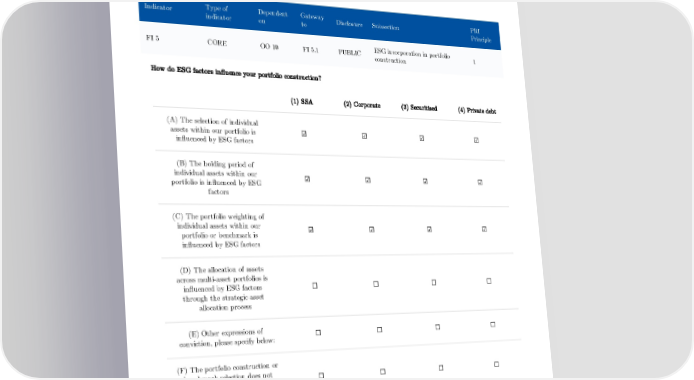 (B) We anticipate how the evolution of ESG factors may change the ESG profile of (2) in the majority of cases the debt issuer ESG incorporation in portfolio construction Type of Dependent Gateway PRI Indicator Disclosure Subsection indicator on to Principle ESG incorporation in portfolio FI 5 CORE OO 10 FI 5.1 PUBLIC 1 construction How do ESG factors influence your portfolio construction? (1) SSA (2) Corporate (3) Securitised (4) Private debt (A) The selection of individual assets within our portfolio is ☑ ☑ ☑ ☑ influenced by ESG factors (B) The holding period of individual assets within our ☑ ☑ ☑ ☑ portfolio is influenced by ESG factors (C) The portfolio weighting of individual assets within our ☑ ☑ ☑ ☑ portfolio or benchmark is influenced by ESG factors (D) The allocation of assets across multi-asset portfolios is influenced by ESG factors ☐ ☐ ☐ ☐ through the strategic asset allocation process (E) Other expressions of ☐ ☐ ☐ ☐ conviction, please specify below: (F) The portfolio construction or benchmark selection does not ☐ ☐ ☐ ☐ explicitly include the incorporation of ESG factors 124