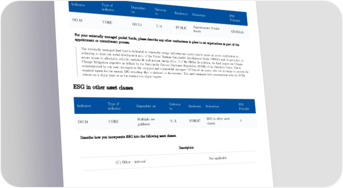 Context and explanation Appointment: Pooled funds Type of Dependent Gateway PRI Indicator Disclosure Subsection indicator on to Principle Appointment: Pooled OO 33 CORE OO 5.1 N/A PUBLIC GENERAL funds For your externally managed pooled funds, please describe any other mechanisms in place to set expectations as part of the appointment or commitment process. The externally managed fund that is dedicated to renewable energy infrastructure assets aims to make an active contribution to achieving at least one social development goal of the United Nations Sustainable Development Goals (“SDGs”) and, in particular, to secure access to affordable, reliable, sustainable and modern energy (Goal 7 of the SDGs). In addition, the fund targets the Climate Change Mitigation objective as defined by the Sustainable Finance Disclosure Regulation (SFDR) of the European Union. This is communicated by our asset managers to the technical and commercial managers (TCMs) of the assets, who are in charge to provide the required inputs for the annual ESG reporting that is disclosed to the investor. The asset managers held conversations with the TCMs almost on a dayly basis or as the transaction might require. ESG in other asset classes Type of Gateway PRI Indicator Dependent on Disclosure Subsection indicator to Principle Multiple, see ESG in other asset OO 34 CORE N/A PUBLIC 1 guidance classes Describe how you incorporate ESG into the following asset classes. Description (C) Other – internal Not applicable 34