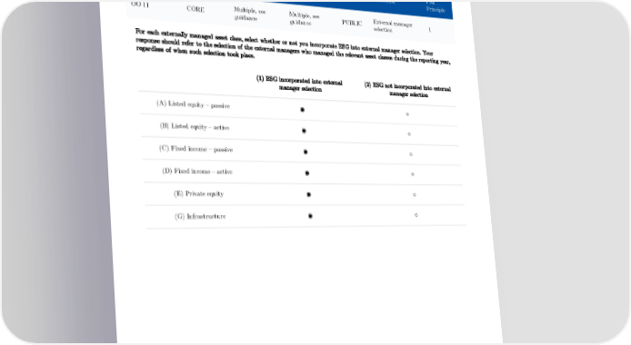 External manager selection Type of PRI Indicator Dependent on Gateway to Disclosure Subsection indicator Principle Multiple, see Multiple, see External manager OO 11 CORE PUBLIC 1 guidance guidance selection For each externally managed asset class, select whether or not you incorporate ESG into external manager selection. Your response should refer to the selection of the external managers who managed the relevant asset classes during the reporting year, regardless of when such selection took place. (1) ESG incorporated into external (2) ESG not incorporated into external manager selection manager selection (A) Listed equity – passive ◉ ○ (B) Listed equity – active ◉ ○ (C) Fixed income – passive ◉ ○ (D) Fixed income – active ◉ ○ (E) Private equity ◉ ○ (G) Infrastructure ◉ ○ 22