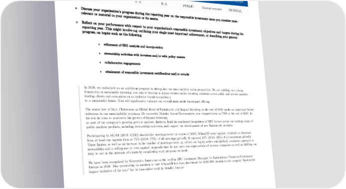 Annual overview Indicator Type of indicator Dependent on Gateway to Disclosure Subsection PRI Principle SLS 1 S2 CORE N/A N/A PUBLIC Annual overview GENERAL Discuss your organisation’s progress during the reporting year on the responsible investment issue you consider most relevant or material to your organisation or its assets. Reflect on your performance with respect to your organisation’s responsible investment objectives and targets during the reporting year. This might involve e.g. outlining your single most important achievement, or describing your general progress, on topics such as the following: refinement of ESG analysis and incorporation stewardship activities with investees and/or with policy makers collaborative engagements attainment of responsible investment certifications and/or awards In 2020, we embarked on an ambitious program to strengthen our sustainability value proposition. We are building on a strong foundation in sustainable investing and aim to become a shaper of sustainable investing solutions across public and private markets – leading clients and companies on an inclusive transition pathway to a sustainable future. This will significantly enhance our overall sustainable investment offering. The senior hire of Matt Christensen as Global Head of Sustainable and Impact Investing at the end of 2020 marks an important further milestone in our sustainability roadmap. He succeeded Beatrix Anton-Groenemeyer, who stepped down as CSO at the end of 2020. In his role he aims to accelerate the growth of Impact Investing as part of the company’s growing private markets platform; lead the continued integration of ESG factors across our existing range of public markets products, including stewardship activities; and support the development of new Sustainable products. Participating in 10,183 (2019: 9,532) shareholder meetings over the course of 2020, AllianzGI voted against, withheld or abstained from at least one agenda item at 72% (2019: 77%) of all meetings globally. It opposed 23% (2019: 24%) of all resolutions globally. These figures, as well as an increase in the number of meetings voted at, reflect our highly active and globally consistent approach to stewardship and a willingness to vote against proposals that do not meet our expectations of investee companies as well as fulfilling our duty to act in the interests of clients by considering each proposal on merit. We have been recognized by Greenwich Associates as the leading ESG Investment Manager for Institutional Clients in Continental Europe in 2020. Also noteworthy to mention is that AllianzGI has been shortlisted for 2020 PRI Awards in the category ‘Real-world impact initiative of the year’ for its innovative work in blended finance. 5