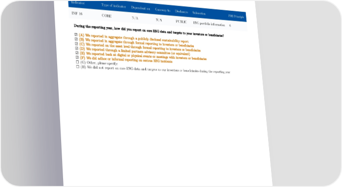 Reporting/Disclosure ESG portfolio information Indicator Type of indicator Dependent on Gateway to Disclosure Subsection PRI Principle INF 16 CORE N/A N/A PUBLIC ESG portfolio information 6 During the reporting year, how did you report on core ESG data and targets to your investors or beneficiaries? ☑ (A) We reported in aggregate through a publicly disclosed sustainability report ☑ (B) We reported in aggregate through formal reporting to investors or beneficiaries ☑ (C) We reported on the asset level through formal reporting to investors or beneficiaries ☑ (D) We reported through a limited partners advisory committee (or equivalent) ☑ (E) We reported back at digital or physical events or meetings with investors or beneficiaries ☑ (F) We did adhoc or informal reporting on serious ESG incidents ☐ (G) Other, please specify: ☐ (H) We did not report on core ESG data and targets to our investors or beneficiaries during the reporting year 154