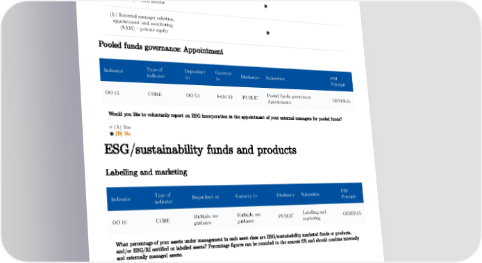 (J) External manager selection, appointment and monitoring ◉ (SAM) – listed equity (K) External manager selection, appointment and monitoring ◉ (SAM) – fixed income (L) External manager selection, appointment and monitoring ◉ (SAM) – private equity Pooled funds governance: Appointment Type of Dependent Gateway PRI Indicator Disclosure Subsection indicator on to Principle Pooled funds governance: OO 15 CORE OO 5.1 SAM 12 PUBLIC GENERAL Appointment Would you like to voluntarily report on ESG incorporation in the appointment of your external managers for pooled funds? ○ (A) Yes ◉ (B) No ESG/sustainability funds and products Labelling and marketing Type of PRI Indicator Dependent on Gateway to Disclosure Subsection indicator Principle Multiple, see Multiple, see Labelling and OO 16 CORE PUBLIC GENERAL guidance guidance marketing What percentage of your assets under management in each asset class are ESG/sustainability marketed funds or products, and/or ESG/RI certified or labelled assets? Percentage figures can be rounded to the nearest 5% and should combine internally and externally managed assets. Percentage (A) Listed equity – passive 0.0% 26