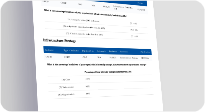 Infrastructure: Ownership level Type of Dependent Gateway PRI Indicator Disclosure Subsection indicator on to Principle Infrastructure: Ownership OO 29 CORE OO 5 N/A PUBLIC GENERAL level What is the percentage breakdown of your organisation's infrastructure assets by level of ownership? (A) A majority stake (50% and above) (5) >75% (B) A significant minority stake (between 10–50%) (2) 1–10% (C) A limited minority stake (less than 10%) (2) 1–10% Infrastructure: Strategy Indicator Type of indicator Dependent on Gateway to Disclosure Subsection PRI Principle OO 30 CORE OO 5 N/A PUBLIC Infrastructure: Strategy GENERAL What is the percentage breakdown of your organisation's internally managed infrastructure assets by investment strategy? Percentage of total internally managed infrastructure AUM (A) Core >75% (B) Value added 0.0% (C) Opportunistic 0.0% 32