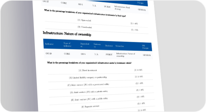 Infrastructure: Fund strategy Type of Dependent Gateway PRI Indicator Disclosure Subsection indicator on to Principle Infrastructure: Fund OO 27 CORE OO 5 N/A PUBLIC GENERAL strategy What is the percentage breakdown of your organisation's infrastructure investments by fund type? (A) Open-ended (2) 1–10% (B) Closed-ended (5) >75% Infrastructure: Nature of ownership Type of Dependent Gateway PRI Indicator Disclosure Subsection indicator on to Principle Infrastructure: Nature of OO 28 CORE OO 5 N/A PUBLIC GENERAL ownership What is the percentage breakdown of your organisation's infrastructure assets by investment vehicle? (A) Direct investment (3) 11–50% (B) Limited liability company or partnership (3) 11–50% (C) Joint venture (JV) with a government entity (2) 1–10% (D) Joint venture (JV) with a private entity (2) 1–10% (E) Joint venture (JV) with a public entity (2) 1–10% (F) Separate account (2) 1–10% (G) Special purpose vehicle (3) 11–50% 31