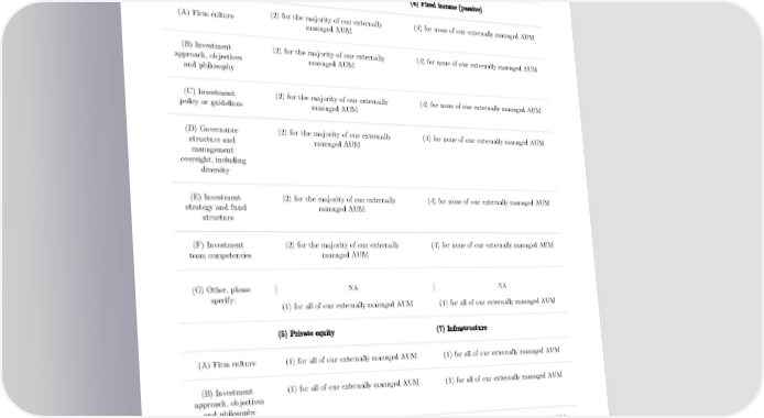 (G) Other, please NA NA specify: (1) for all of our externally managed AUM (1) for all of our externally managed AUM (3) Fixed income (active) (4) Fixed income (passive) (2) for the majority of our externally (4) for none of our externally managed AUM (A) Firm culture managed AUM (B) Investment (2) for the majority of our externally (4) for none of our externally managed AUM approach, objectives managed AUM and philosophy (C) Investment (2) for the majority of our externally (4) for none of our externally managed AUM policy or guidelines managed AUM (D) Governance (2) for the majority of our externally (4) for none of our externally managed AUM structure and managed AUM management oversight, including diversity (E) Investment (2) for the majority of our externally (4) for none of our externally managed AUM strategy and fund managed AUM structure (F) Investment (2) for the majority of our externally (4) for none of our externally managed AUM team competencies managed AUM (G) Other, please NA NA specify: (1) for all of our externally managed AUM (1) for all of our externally managed AUM (5) Private equity (7) Infrastructure (A) Firm culture (1) for all of our externally managed AUM (1) for all of our externally managed AUM (B) Investment (1) for all of our externally managed AUM (1) for all of our externally managed AUM approach, objectives and philosophy (C) Investment (1) for all of our externally managed AUM (1) for all of our externally managed AUM policy or guidelines 86