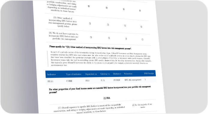 (B) Companies, sectors, countries and currency are monitored for ☐ ☐ ☐ ☑ changes in ESG exposure and for breaches of risk limits (C) Overall exposure to specific ESG factors is measured for our portfolio construction, and sizing ☑ ☑ ☑ ☑ or hedging adjustments are made depending on individual issuers' sensitivity to these factors (D) Other method of incorporating ESG factors into ☐ ☐ ☐ ☑ risk management process, please specify below: (E) We do not have a process to incorporate ESG factors into our ☐ ☐ ☐ ☐ portfolio risk management Please specify for "(D) Other method of incorporating ESG factors into risk management process". As part of a periodic review of the investments during the monitoring phase, AllianzGI Investment and Risk Management teams considers whether key ESG risks have arisen since the prior review and if applicable develop an action plan to alleviate the ESG risks that have been identified. For particular strategies with a certain degree of flexibility to implement lender specific requests, AllianzGI Investment teams take the lead in embedding certain ESG specific clauses within the financing documentation. Among other examples, this typically gives AllianzGI investors the ability to be automatically prepaid if, for example, a borrower materially breaches an environmental law. Indicator Type of indicator Dependent on Gateway to Disclosure Subsection PRI Principle FI 2.1 CORE FI 2 N/A PUBLIC ESG risk management 1 For what proportion of your fixed income assets are material ESG factors incorporated into your portfolio risk management process? (1) SSA (C) Overall exposure to specific ESG factors is measured for our portfolio (2) for the majority of our construction, and sizing or hedging adjustments are made depending on individual assets issuers' sensitivity to these factors (2) Corporate 121