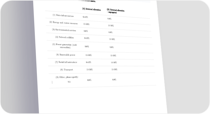 Indicator Type of indicator Dependent on Gateway to Disclosure Subsection PRI Principle OO 5.2 INF CORE OO 5, OO 5.1 N/A PUBLIC Asset breakdown GENERAL Provide a further breakdown of your infrastructure assets. (B) External allocation (A) Internal allocation – segregated (1) Data infrastructure 0-10% 0.0% (2) Energy and water resources 10-50% 10-50% (3) Environmental services 0.0% 0.0% (4) Network utilities 0-10% 10-50% (5) Power generation (excl. 0.0% 0.0% renewables) (6) Renewable power 10-50% 10-50% (7) Social infrastructure 0-10% 10-50% (8) Transport 10-50% 10-50% (9) Other, please specify: 0.0% 0.0% NA 13