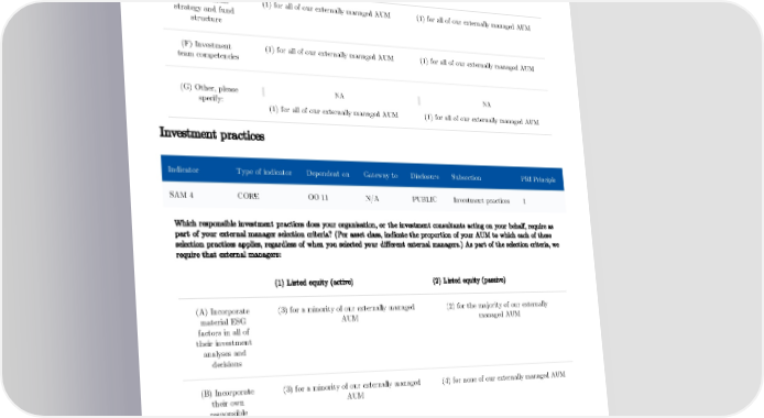 (D) Governance (1) for all of our externally managed AUM (1) for all of our externally managed AUM structure and management oversight, including diversity (E) Investment (1) for all of our externally managed AUM (1) for all of our externally managed AUM strategy and fund structure (F) Investment (1) for all of our externally managed AUM (1) for all of our externally managed AUM team competencies (G) Other, please NA NA specify: (1) for all of our externally managed AUM (1) for all of our externally managed AUM Investment practices Indicator Type of indicator Dependent on Gateway to Disclosure Subsection PRI Principle SAM 4 CORE OO 11 N/A PUBLIC Investment practices 1 Which responsible investment practices does your organisation, or the investment consultants acting on your behalf, require as part of your external manager selection criteria? (Per asset class, indicate the proportion of your AUM to which each of these selection practices applies, regardless of when you selected your different external managers.) As part of the selection criteria, we require that external managers: (1) Listed equity (active) (2) Listed equity (passive) (A) Incorporate (3) for a minority of our externally managed (2) for the majority of our externally material ESG AUM managed AUM factors in all of their investment analyses and decisions (B) Incorporate (3) for a minority of our externally managed (4) for none of our externally managed AUM their own AUM responsible investment policy into their asset allocation decisions 87