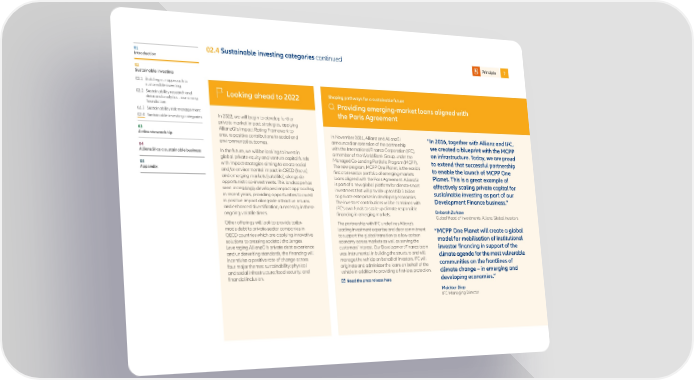 01 02.4 Sustainable investing categories continued Principle 7 Introduction 02 Sustainable investing 02.1 Building our approach to sustainable investing Shaping pathways for a sustainable future 02.2 Sustainability research and Looking ahead to 2022 data and analytics – our strong Providing emerging-market loans aligned with foundation 02.3 Sustainability risk management the Paris Agreement 02.4 Sustainable investing categories In 2022, we will begin to develop further private market impact strategies, applying 03 AllianzGI’s Impact Rating Framework to In November 2021, Allianz and AllianzGI Active stewardship ensure positive contributions to social and “In 2016, together with Allianz and IFC, environmental outcomes. announced an extension of the partnership we created a blueprint with the MCPP 04 with the International Finance Corporation (IFC), AllianzGI as a sustainable business In the future, we will be looking to invest in a member of the World Bank Group, under the on infrastructure. Today, we are proud global private equity and venture capital funds Managed Co-Lending Portfolio Program (MCPP). to extend that successful partnership 05 with impact strategies aiming to create social The new program, MCPP One Planet, is the world’s to enable the launch of MCPP One Appendix and/or environmental impact in OECD (focus) first cross-sector portfolio of emerging-markets and emerging markets (satellite), alongside loans aligned with the Paris Agreement. AllianzGI Planet. This is a great example of opportunistic co-investments. This landscape has is part of a new global platform for climate-smart effectively scaling private capital for seen increasingly developed impact approaches investment that will provide up to USD 3 billion sustainable investing as part of our in recent years, providing opportunities to invest to private enterprises in developing economies. in positive impact alongside attractive returns The investors’ contributions will be combined with Development Finance business.” and enhanced diversification, a necessity in these IFC’s own funds to scale up climate-responsible ongoing volatile times. financing in emerging markets. Deborah Zurkow Global Head of Investments, Allianz Global Investors Other offerings will look to provide tailor- The partnership with IFC underlines Allianz’s made debt to private-sector companies in leading investment expertise and clear commitment “MCPP One Planet will create a global OECD countries which are applying innovative to support the global transition to a low-carbon model for mobilisation of institutional solutions to pressing societal challenges. economy across markets as well as serving the Leveraging AllianzGI’s private debt experience customers’ interest. Our Development Finance team investor financing in support of the and underwriting standards, the financing will was instrumental in building the structure and will climate agenda for the most vulnerable incentivise a positive rate of change across manage the vehicle on behalf of investors. IFC will communities on the frontlines of four major themes: sustainability; physical originate and administer the loans on behalf of the and social infrastructure; food security; and vehicle in addition to providing a first-loss protection. climate change – in emerging and financial inclusion. Read the press release here developing economies.” Makhtar Diop IFC Managing Director