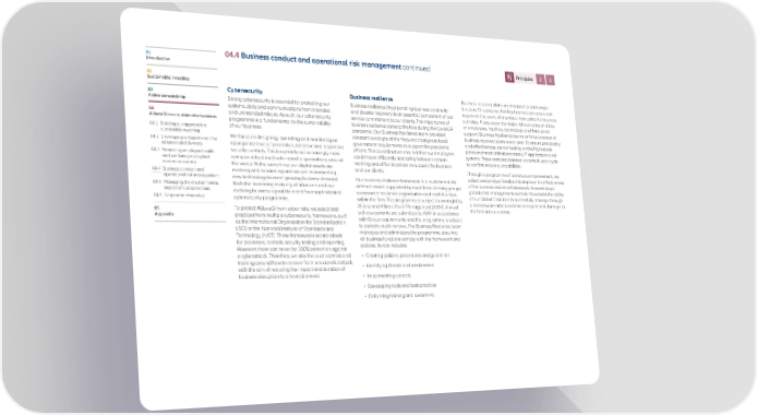 01 04.4 Business conduct and operational risk management continued Principles 3 5 Introduction 02 Sustainable investing Cybersecurity Business resilience Business recovery plans are mapped to each major 03 function. This ensures that key business processes can Active stewardship Strong cybersecurity is essential for protecting our Business resilience (incorporating business continuity resume in the event of a serious interruption to business systems, data and communications from intended and disaster recovery) is an essential component of our activities. Plans cover the major risk scenarios of a loss 04 and unintended misuse. As such, our cybersecurity service commitment to our clients. The importance of of employees, facilities, technology and third-party AllianzGI as a sustainable business programme is a fundamental to the sustainability business resilience came to the fore during the Covid-19 04.1 B uilding our approach to of our business. pandemic. Our Business Resilience team provided support. Business Resilience teams enforce a review of sustainable investing constant oversight of the frequent changes to local business recovery plans every year. To ensure practicality 04.2 Developing a shared vision for We focus on designing, operating and monitoring an government requirements to support the pandemic and effectiveness, we run testing on the highest risk inclusion and diversity appropriate level of preventive, detective and responsive efforts. This co-ordination ensured that our employees plans and most critical processes, IT applications and 04.3 P romoting employee health security controls. This is a priority as increasingly more could move efficiently and safely between remote systems. These tests are planned on a multi-year cycle and wellbeing in a hybrid complex attack methods impact organisations around working and office locations to support the business to confirm recovery capabilities. work environment the world. At the same time, our digital assets are and our clients. Through a programme of continuous improvement, we 04.4 Business conduct and evolving and expanding and we are implementing collect and analyse feedback to improve the effectiveness operational risk management new technology to meet growing business demand. Our business resilience framework is a multi-tiered risk 04.5 Managing the environmental Both the increasing maturity of attackers and our defence model supported by input from steering groups, of the business resilience framework. A recent major impact of our operations evolving business signal the need for a sophisticated a corporate resilience organisation and each function global crisis management exercise showcased the ability 04.6 Corporate citizenship cybersecurity programme. within the firm. The programme is subject to oversight by of our Global Crisis Unit to successfully manage through Allianz and Allianz Asset Management (AAM). Annual a ransomware attack and minimise potential damage to 05 To protect AllianzGI from cyber risks, we select best self-assessments are submitted to AAM in accordance the firm and our clients. Appendix practices from multiple cybersecurity frameworks, such with Group requirements and the programme is subject as the International Organization for Standardization to periodic audit reviews. The Business Resilience team (ISO) or the National Institute of Standards and manages and administers the programme, ensuring Technology (NIST). These frameworks set standards all business functions comply with the framework and for processes, controls, security testing and reporting. policies. Its role includes: However, there can never be 100% protection against a cyberattack. Therefore, we also focus on controls and • Creating policies, procedures and guidelines training around how to recover from a successful attack, • Identifying threats and weaknesses with the aim of reducing the impact and duration of business disruption to a tolerable level. • Implementing controls • Developing tools and best practices • Delivering training and awareness.