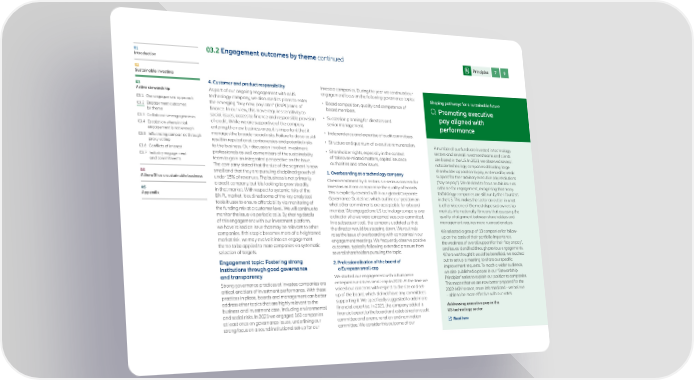 01 03.2 Engagement outcomes by theme continued Principles 7 9 Introduction 02 Sustainable investing 03 4. Customer and product responsibility investee companies. During the year we continued our Active stewardship As part of our ongoing engagement with a US engagement focus on the following governance topics: Shaping pathways for a sustainable future 03.1 Our engagement approach technology company, we discussed its plans to enter • Board composition, quality and competence of Promoting executive 03.2 Engagement outcomes the emerging “buy now, pay later” (BNPL) area of board members. by theme finance. In our view, this move requires sensitivity to pay aligned with social issues, access to finance and responsible provision • Succession planning for directors and 03.3 Collaborative engagements of credit. While we are supportive of the company senior management. performance 03.4 Escalation where initial entering the new business area, it is important that it engagement is not enough manages the broader social risks. Failure to do so could • Independence and expertise of audit committees. 03.5 Influencing companies through result in reputational controversies and potential risks • Structure and quantum of executive remuneration. proxy voting A number of our funds are invested in technology 03.6 Conflicts of interest to the business. Our discussion involved investment • Shareholder rights, especially in the context sectors and several investment teams and clients 03.7 Industry engagement professionals as well as members of the sustainability of takeover-related matters, capital issuance are based in the US. In 2021, we observed several and commitments team to gain an integrated perspective on the issue. authorities and other issues. notable technology companies attracting large The company stated that the size of the segment is now shareholder opposition to pay, evidenced by weak 04 small and that they are pursuing disciplined growth of 1. Overboarding at a technology company support for their advisory executive pay resolutions AllianzGI as a sustainable business under 15% of revenues. The business is not primarily Overcommitment by directors is a serious concern for (“say on pay”). We decided to focus on this issue as a credit company, but it is looking to grow steadily investors as it can compromise the quality of boards. a theme for engagement, recognising that many 05 in that market. With respect to systemic risks of the This is explicitly covered within our global Corporate technology companies are still run by their founders Appendix BNPL market, it outlined some of the key analytical Governance Guidelines which outline our position on in the US. This makes the sector an outlier in what tools it uses to ensure affordability via monitoring of what other commitments are acceptable for a board is otherwise one of the most dispersed ownership the funding mix at a customer level. We will continue to member. We engaged one US technology company over markets internationally. It means that assessing the monitor the issue via periodic calls. By sharing details a director who we were concerned was over-committed. quality of alignment between shareholders and of this engagement with our investment platform, In a subsequent call, the company updated us that management requires more nuanced analysis. we have raised an issue that may be relevant to other the director would be stepping down. We routinely companies. If this topic becomes more of a heightened raise the issue of overboarding with companies in our We selected a group of 10 companies for follow- market risk, we may evolve it into an engagement engagement meetings. We frequently observe positive up on the basis of their portfolio importance, theme to be applied to more companies via systematic outcomes, typically following extended pressure from the weakness of overall support for their “say on pay”, selection of targets. several shareholders pursuing the topic. and issues identified through previous engagements. Where we thought it would be beneficial, we reached Engagement topic: Fostering strong 2. P rofessionalisation of the board of out to set up a meeting to share our specific institutions through good governance a European small-cap improvement requests. To reach a wider audience, and transparency We started our engagement with a European we also published a paper in our “Stewardship Strong governance practices at investee companies are entrepreneur-driven small-cap in 2020. At the time we Principles” series to explain our position to companies. critical enablers of investment performance. With these voiced our concerns with respect to the size and set- This means that we are now better prepared for the practices in place, boards and management can better up of the board, which did not have any committees 2022 AGM season, more informed and – we believe address other topics that are highly relevant to the supporting it. We specifically suggested to add more – able to be more effective with our votes. business and investment case, including environmental financial expertise. In 2021, the company added a Addressing executive pay in the and social risks. In 2021 we engaged 160 companies financial expert to the board and established an audit US technology sector at least once on governance issues, underlining our committee and a remuneration and nomination Read here strong focus on a sound institutional set-up for our committee. We consider this outcome of our