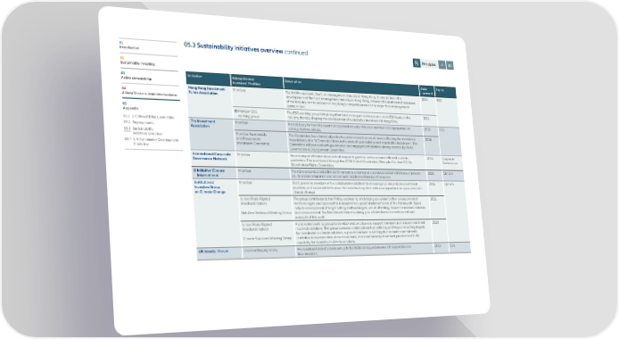 01 05.3 Sustainability initiatives overview continued Principles 4 10 Introduction 02 Sustainable investing 03 Initiative Allianz Global Description Date Topics Active stewardship Investors‘ Position – present Hong Kong Investment Member The HKIFA represents the fund management industry of Hong Kong. It aims to foster the 2004 ESG 04 Funds Association development of the fund management industry in Hong Kong, enhance the professional standards AllianzGI as a sustainable business of the industry and to maintain Hong Kong's competitiveness as the major fund management centre in Asia. 05 Member ESG The ESG working group brings together fund managers to discuss on current ESG topics in the 2021 Appendix working group industry, thereby shaping the development of sustainable investment in Hong Kong. 05.1 UK Stewardship Code index The Investment Member A trade body for the UK's asset management industry. We are a member and represented on 2015 ESG 05.2 Engagements Association various working groups. 05.3 Sustainability Member Sustainable The Committee has a broad objective to consider and lead on all issues affecting the Investment 2018 initiatives overview and Responsible Association’s (the “IA”) member firms in the area of sustainability and responsible investment. The 05.4 U N Sustainable Development Investment Committee Committee will not deal with governance and engagement matters already covered by the IA Goals key Governance & Engagement Committee. International Corporate Member Aims to inspire effective standards of corporate governance to advance efficient markets 2015 Corporate Governance Network worldwide. This is achieved through the ICGN Global Governance Principle. Co-chair ICGN's Governance Shareholder Rights Committee. Initiative Climate Member The iCI represents a collective commitment to understand and reduce carbon emissions of private- 2021 Climate International equity based companies and secure sustainable investment performance. Institutional Member IIGCC provides investors with a collaborative platform to encourage public policies, investment 2016 Climate Investors Group practices, and corporate behaviour that address long-term risks and opportunities associated with on Climate Change climate change. (under Paris Aligned The group contributes to the PAII by addressing analytical gaps where further development of 2021 Investor initiative) methodologies and approaches is required to support implementation of the Framework. Topics include development of target setting methodologies, use of offsetting, Scope 3 emissions inclusion Net Zero Technical Working Group and measurement. The Net Zero technical working group takes forward development and oversight of this work. (under Paris Aligned A dedicated working group to develop best practice and support members to increase investment 2020 Investor initiative) in climate solutions. This group oversees analytical work on defining pathways and setting targets for investment in climate solutions, support members to set targets and make commitments Climate Solutions Working Group in relation to investment in climate solutions, and more broadly share best practice and build capability for investing in climate solutions. UK Investor Forum Underwriting signatory An investment industry body set up to facilitate dialogue between UK corporates and 2015 ESG their investors.