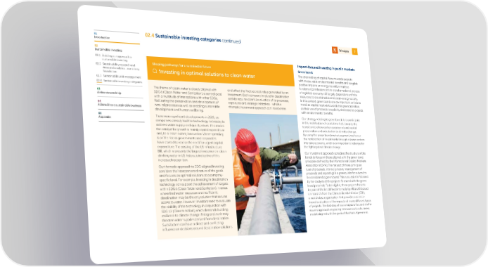 01 02.4 Sustainable investing categories continued Principle 7 Introduction 02 Sustainable investing 02.1 Building our approach to Impact-focused investing in public markets sustainable investing Shaping pathways for a sustainable future Green bonds 02.2 Sustainability research and data and analytics – our strong Investing in optimal solutions to clean water The channelling of capital flows towards projects foundation with measurable environmental benefits and tangible 02.3 Sustainability risk management positive impacts on energy transition marks a 02.4 Sustainable investing categories fundamental milestone in the transformational process The theme of clean water is closely aligned with and affect the final societal value generated by an of a global economy still largely dependent on finite 03 SDG 6 (Clean Water and Sanitation), a central goal investment. Each company involved in desalination resources, to a sustainable and clean-energy society. Active stewardship with a multitude of interactions with other SDGs, activity requires careful evaluation of its processes, In this context, green bonds are an important vehicle to facilitating the preservation and development of exposures and strategic initiatives – which a mobilise capital markets towards this green transition, 04 natural processes as well as enabling sustainable thematic investment approach can incorporate. as their use of proceeds is explicitly dedicated to projects AllianzGI as a sustainable business development and human wellbeing. with environmental benefits. 05 There were significant developments in 2021, as Our strategy relating to green bonds is to participate Appendix companies already had the technology necessary to in this mobilisation of capital markets towards the address water supply and quality issues. This means transition to a low-carbon society, natural capital the catalyst for growth is mainly capital expenditure preservation and adaptation to climate change. and, to a lesser extent, innovation. Water spending By using the green bond market segment, we favour is on the rise as governments and corporates the reallocation of investments through a lower carbon- have started to realise the need for urgent capital intensive economy, which is an important challenge for expenditure. The passing of the US Infrastructure the fight against climate change. Bill, which represents the largest investment in clean Our investment approach considers the structure of the drinking water in US history, is indicative of this bonds to focus on those aligned with the green bond increased recognition. principles defined by the International Capital Markets Our thematic approach to SDG-aligned investing Association (ICMA). The respect of those principles considers the interconnected nature of the goals (use of proceeds, internal process, management of and focuses on optimal solutions at a company- proceeds and reporting) is a prerequisite for a bond to specific level. For example, investing in desalination be considered a green bond. This evaluation is followed technology can support the achievement of targets by the analysis of the projects financed with the green within SDG 6 (Clean Water and Sanitation). In areas bond proceeds. To be eligible, these projects have to where freshwater resources are insufficient, be part of the list defined internally by AllianzGI based desalination may be the only solution that secures on research from the Climate Bonds Initiative (CBI), access to water. However, investors need to evaluate a world-class organisation that provides a science- the viability of the technology in conjunction with based evaluation of the impacts of many different types SDG 13 (Climate Action), which demands building of projects. The last step of our analysis is focused on the resilience to climate change. Rising sea levels may issuer’s approach regarding its transition to a business threaten water supplies derived from desalination. model aligned with the goal of the Paris Agreement. Such factors can have a direct and conflicting influence on decisions around desalination solutions