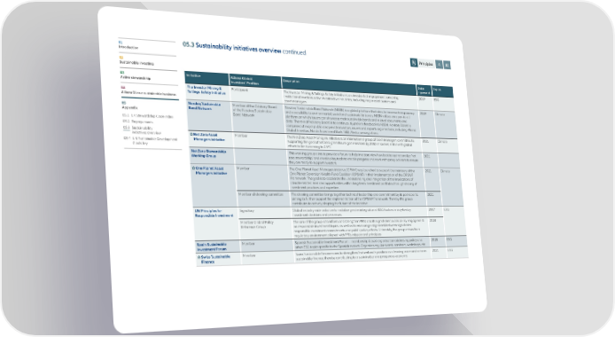 01 05.3 Sustainability initiatives overview continued Principles 4 10 Introduction 02 Sustainable investing 03 Initiative Allianz Global Description Date Topics Active stewardship Investors‘ Position – present The Investor Mining & Participant The Investor Mining & Tailings Safety Initiative is an investor-led engagement convening 2019 ESG 04 Tailings Safety Initiative institutional investors active in extractive industries, including major asset owners and AllianzGI as a sustainable business asset managers. 05 Nasdaq Sustainable Member of the Advisory Board Nasdaq Sustainable Bond Network (NSBN) is a global platform that aims to increase transparency 2019 Climate Appendix Bond Network of the Nasdaq Sustainable and accessibility to environmental, social and sustainability bonds. NSBN utilises an open-to-all Bond Network platform on which issuers can showcase their sustainable bonds and related documents and 05.1 UK Stewardship Code index data. The role of Advisory Board is to continuously provide feedback to NSBN. Advisory Board is 05.2 Engagements comprised of major public and private investors, issuers and experts organisations, including Allianz 05.3 Sustainability Global Investors, Nordic Investment Bank, SEB, Alecta, among others. initiatives overview Net Zero Asset Member The Net Zero Asset Managers initiative is an international group of asset managers committed to 2021 Climate 05.4 U N Sustainable Development Managers initiative supporting the goal of net zero greenhouse gas emissions by 2050 or sooner, in line with global Goals key efforts to limit warming to 1.5ºC. Net Zero Stewardship This working group aims to provide a forum to help investors view how best to operationalize ‘net 2021 Working Group zero stewardship,’ and develop key tools to enable progress and work with proxy advisors to ensure they are ready to support investors. One Planet Asset Member The One Planet Asset Managers initiative (OPAM) was launched to support the members of the 2021 Climate Managers initiative One Planet Sovereign Wealth Fund Coalition (OPSWF) in their implementation of the OPSWF Framework. The goal is to accelerate the understanding and integration of the implications of climate-related risks and opportunities within long-term investment portfolios through sharing of investment practices and expertise. Member of steering committee The steering committee brings together technical leadership and commitment by its participants 2021 aiming to further support the implementation of the OPSWF framework. Thereby this group contributes to actively shaping the future of the initiative. UN Principles for Signatory Global industry-wide initiative to mobilise greater integration of ESG factors in day-to-day 2007 ESG Responsible Investment investment decisions and processes. Member Global Policy The aim of the group is to inform and strengthen PRI's and its signatories' public policy engagement 2018 Reference Group on responsible investment topics, as well as to encourage alignment between signatories' responsible investment commitments and public policy efforts. Ultimately, the group strives for a regulatory environment aligned with PRI's mission and principles. Spain Sustainable Member Spanish Sustainable Investment Forum – membership-based organisation addressing policy and 2018 ESG Investment Forum other ESG topics specific to the Spanish market. Organises regular events, seminars, workshops, etc. Swiss Sustainable Member Swiss Sustainable Finance aims to strengthen Switzerland´s position as a leading voice and actor in 2021 ESG Finance sustainable finance, thereby contributing to a sustainable and prosperous economy.