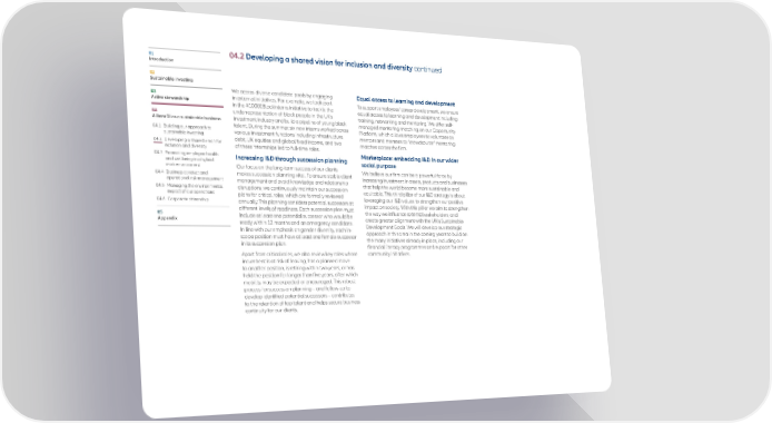 01 04.2 Developing a shared vision for inclusion and diversity continued Introduction 02 Sustainable investing 03 We access diverse candidate pools by engaging Equal access to learning and development Active stewardship in external initiatives. For example, we took part To support employees’ career development, we ensure in the #10000Blackinterns initiative to tackle the equal access to learning and development including 04 underrepresentation of black people in the UK’s training, networking and mentoring. We offer self- AllianzGI as a sustainable business investment industry and build a pipeline of young black managed mentoring matching on our Opportunity 04.1 B uilding our approach to talent. During the summer, six new interns worked across Platform, which allows employees to volunteer as sustainable investing various investment functions including infrastructure mentors and mentees to “crowdsource” mentoring 04.2 Developing a shared vision for debt, UK equities and global fixed income, and two matches across the firm. inclusion and diversity of these internships led to full-time roles. 04.3 Promoting employee health Increasing I&D through succession planning Marketplace: embedding I&D in our wider and wellbeing in a hybrid social purpose work environment Our focus on the long-term success of our clients We believe our firm can be a powerful force by 04.4 Business conduct and makes succession planning vital. To ensure stable client increasing investment in assets, products and businesses operational risk management management and avoid knowledge and relationship 04.5 Managing the environmental disruptions, we continuously maintain our succession that help the world become more sustainable and impact of our operations plans for critical roles, which are formally reviewed equitable. This third pillar of our I&D strategy is about 04.6 Corporate citizenship annually. This planning considers potential successors at leveraging our I&D values to strengthen our positive different levels of readiness. Each succession plan must impact on society. With this pillar we aim to strengthen 05 include at least one potential successor who would be the way we influence external stakeholders, and Appendix ready within 12 months and an emergency candidate. create greater alignment with the UN’s Sustainable In line with our emphasis on gender diversity, each in- Development Goals. We will develop our strategic scope position must have at least one female successor approach in this area in the coming years to build on in its succession plan. the many initiatives already in place, including our financial literacy programmes and support for other Apart from critical roles, we also review key roles whose community initiatives. incumbent is at risk of leaving, has a planned move to another position, is retiring within two years, or has held the position for longer than five years, after which mobility may be expected or encouraged. This robust process for succession planning – and follow-up to develop identified potential successors – contributes to the retention of top talent and helps secure business continuity for our clients.