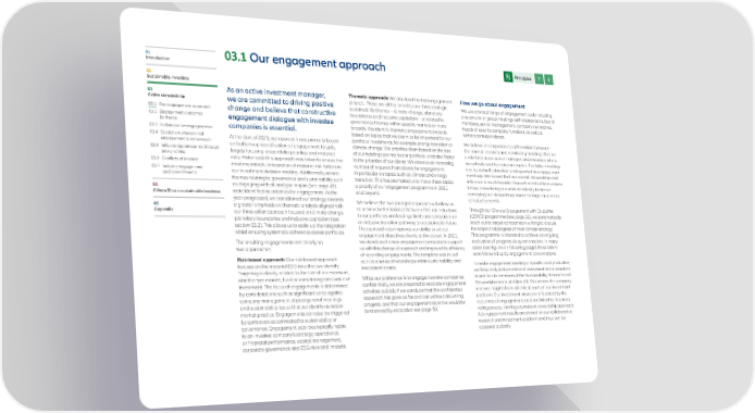 01 03.1 Our engagement approach Principles 7 9 Introduction 02 Sustainable investing As an active investment manager, Thematic approach: We also lead themed engagement How we go about engagement 03 projects. These are either linked to our three strategic Active stewardship we are committed to driving positive sustainability themes – climate change, planetary We use a broad range of engagement tools including 03.1 Our engagement approach change and believe that constructive boundaries and inclusive capitalism – or related to one-on-one or group meetings with chairpersons, board 03.2 Engagement outcomes engagement dialogue with investee governance themes within specific markets or more members, senior management, company secretaries, by theme broadly. We identify thematic engagement projects heads of specific company functions, as well as 03.3 Collaborative engagements companies is essential. based on topics that we deem to be important for our written correspondence. 03.4 E scalation where initial At the start of 2021, our approach was primarily based portfolio investments, for example energy transition or We believe it is important to differentiate between engagement is not enough on bottom-up identification of engagement targets, climate change. We prioritise them based on the size the normal research and monitoring meetings that we 03.5 I nfluencing companies through largely focusing on portfolio priorities and material of our holdings per market or portfolio, and also factor undertake as an active manager, and instances where proxy voting risks. Historically this approach was taken to ensure the in the priorities of our clients. We observe an increasing we actively seek to make an impact. The latter meetings 03.6 Conflicts of interest most meaningful integration of material risk factors in number of requests from clients for engagement, are, by default, classified and reported as engagement 03.7 Industry engagement our investment decision-making. Additionally, several in particular on topics such as climate and energy meetings. We expect that our overall stewardship and and commitments themes relating to governance and sustainability such transition. This has prompted us to make these topics influence is much broader than reflected in the numbers 04 as engaging with oil and gas majors (see page 43). a priority of our engagement programme in 2021 below, considering our work in industry bodies or AllianzGI as a sustainable business were identified as priorities for engagement. As the and beyond. conveying our stewardship stance to larger audiences year progressed, we transitioned our strategy towards We believe this two-pronged approach will allow us at industry events. 05 a greater emphasis on thematic analysis aligned with to achieve better balance between ESG risk reductions Through our Climate Engagement with Outcome Appendix our three-pillar approach focused on climate change, in our portfolios and leading clients and companies on (CEWO) programme (see page 32), we systematically planetary boundaries and inclusive capitalism (see an inclusive transition pathway to a sustainable future. reach out to target companies in writing to discuss section 03.2). This allows us to scale up the integration The approach also improves our ability to set out the scope and progress of their climate strategy. whilst ensuring systematic coherence across portfolios. engagement objectives clearly at the outset. In 2021, This programme is intended to achieve an ongoing The resulting engagements rest clearly on we developed a new engagement template to support evaluation of progress via questionnaires. In many two approaches: us with this change of approach and improve the efficiency cases (see figures on following page) these letters Risk-based approach: Our risk-based approach of recording engagements. The template was rolled were followed up by engagement conversations. focuses on the material ESG risks that we identify. out via a series of workshops within sustainability and To make engagement meetings impactful and productive, Targeting is closely related to the size of our exposure, investment teams. we frequently include relevant investment team members whether per market, fund or considering total value of While our preference is to engage investee companies in addition to members of the Sustainability Research and investment. The focus of engagements is determined confidentially, we are prepared to escalate engagement Stewardship team at AllianzGI. This means the company by considerations such as significant votes against activities publicly if we conclude that the confidential receives insights from all critical parts of our investment company management at past general meetings approach has gone as far as it can without delivering platform. Our investment views are influenced by the and sustainability issues that we identify as below progress, and that our engagement objective would be outcomes of engagements and are linked to the proxy market practice. Engagements can also be triggered best served by escalation see page 50. voting process, forming a consistent stewardship approach. by controversies connected to sustainability or All engagement results are shared on our collaborative governance. Engagement activities typically relate research and investment platform and thus can be to an investee company’s strategy, operational accessed globally. or financial performance, capital management, corporate governance and ESG risks and impacts.