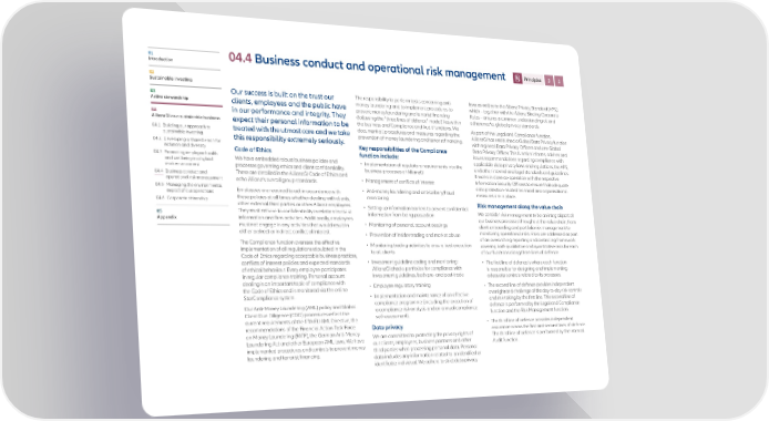 01 04.4 Business conduct and operational risk management Principles 3 5 Introduction 02 Sustainable investing Our success is built on the trust our The responsibility to perform tasks concerning anti- laws as well as to the Allianz Privacy Standard (APS), 03 money laundering and to implement procedures to which – together with the Allianz Binding Corporate Active stewardship clients, employees and the public have prevent money laundering and terrorist financing Rules – ensures a common understanding of, and 04 in our performance and integrity. They (following the “three lines of defence” model) lies within adherence to, global privacy standards. AllianzGI as a sustainable business expect their personal information to be the business and Compliance and Audit functions. We As part of the Legal and Compliance function, 04.1 B uilding our approach to treated with the utmost care and we take document all procedures and measures regarding the AllianzGI has established a Global Data Privacy function sustainable investing this responsibility extremely seriously. prevention of money laundering and terrorist financing. with regional Data Privacy Officers and one Global 04.2 Developing a shared vision for Key responsibilities of the Compliance Data Privacy Officer. This function informs, advises and inclusion and diversity Code of Ethics function include: issues recommendations regarding compliance with 04.3 P romoting employee health We have embedded robust business policies and applicable data privacy laws and regulations, the APS, and wellbeing in a hybrid • Implementation of regulatory requirements into the and other internal and legal standards and guidelines. work environment processes governing ethics and client confidentiality. business processes of AllianzGI It works in close co-operation with the respective 04.4 Business conduct and These are detailed in the AllianzGI Code of Ethics and Information Security Officers to ensure that adequate operational risk management echo Allianz’s overall group standards. • Management of conflicts of interest 04.5 Managing the environmental • Anti-money laundering and anti-bribery/fraud data protection-related technical and organisational impact of our operations Employees are required to act in accordance with measures are in place. 04.6 Corporate citizenship these policies at all times whether dealing with clients, monitoring other external third parties or other Allianz employees. • Setting up information barriers to prevent confidential Risk management along the value chain 05 They must adhere to confidentiality in relation to client information from being passed on We consider risk management to be an integral part of Appendix information and firm activities. Additionally, employees our business processes throughout the value chain, from must not engage in any activities that would result in • Monitoring of personal account dealings client onboarding and portfolio risk management to either a direct or indirect conflict of interest. • Prevention of insider trading and market abuse monitoring operational risks. Risks are addressed as part The Compliance function oversees the effective of an overarching reporting and controlling framework implementation of all regulations stipulated in the • Monitoring trading activities to ensure best execution covering both qualitative and quantitative risks for each Code of Ethics regarding acceptable business practices, to all clients of our functions along three lines of defence: conflicts of interest policies and expected standards • Investment guideline coding and monitoring: • The first line of defence is where each function of ethical behaviour. Every employee participates AllianzGI checks portfolios for compliance with is responsible for designing and implementing in regular compliance training. Personal account investment guidelines, both pre- and post-trade adequate controls related to its processes. dealing is an important topic of compliance with • Employee regulatory training • The second line of defence provides independent the Code of Ethics and is monitored via the online oversight and challenge of the day-to-day risk controls StarCompliance system. • Implementation and maintenance of an effective and risk-taking by the first line. This second line of Our Anti-Money Laundering (AML) policy and Global compliance programme (including the execution of defence is performed by the Legal and Compliance Client Due Diligence (CDD) procedures reflect the a compliance risk analysis and an annual compliance function and the Risk Management function. current requirements of the fifth EU AML Directive, the self-assessment). recommendations of the Financial Action Task Force Data privacy • The third line of defence provides independent on Money Laundering (FATF), the German Anti-Money assurance across the first and second lines of defence. Laundering Act and other European AML laws. We have We are committed to protecting the privacy rights of The third line of defence is performed by the Internal implemented procedures and controls to prevent money our clients, employees, business partners and other Audit function. laundering and terrorist financing. third parties when processing personal data. Personal data includes any information related to an identified or identifiable individual. We adhere to strict data privacy