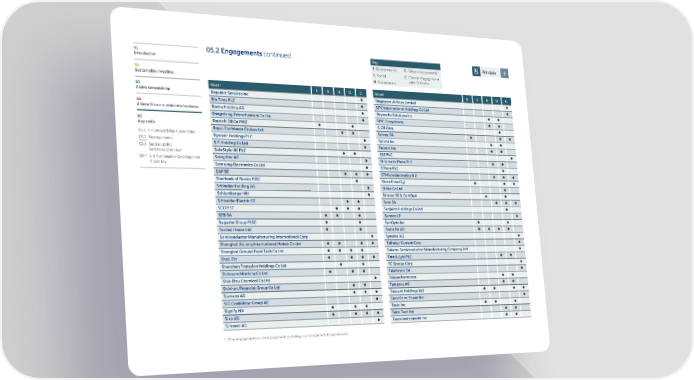 01 05.2 Engagements continued Key Principle 9 Introduction 1 E Environmental O Other engagements S Social C Climate Engagement 02 G Governance with Outcome Sustainable investing 03 Issuer E S G O C Issuer E S G O C Active stewardship Republic Services Inc Singapore Airlines Limited 04 Rio Tinto PLC SITC International Holdings Co Ltd AllianzGI as a sustainable business Roche Holding AG Skyworks Solutions Inc Rongsheng Petrochemical Co Ltd SMC Corp/Japan 05 Rosneft Oil Co PJSC S-Oil Corp Appendix Royal Caribbean Cruises Ltd Solvay SA 05.1 UK Stewardship Code index Ryanair Holdings PLC Splunk Inc 05.2 Engagements S.F. Holding Co Ltd Square Inc 05.3 Sustainability SafeStyle UK PLC SSE PLC initiatives overview 05.4 U N Sustainable Development Salzgitter AG St James's Place PLC Goals key Samsung Electronics Co Ltd SThree PLC SAP SE STMicroelectronics NV Sberbank of Russia PJSC Stora Enso Oyj Schindler Holding AG Strike Co Ltd Schlumberger NV Stroeer SE & Co KGaA Schneider Electric SE Suez SA SCOR SE Sunjuice Holdings Co Ltd SEB SA Sunoco LP Segezha Group PJSC SunOpta Inc Sekisui House Ltd Swiss Re AG Semiconductor Manufacturing International Corp Symrise AG Shanghai Jinjiang International Hotels Co Ltd Taiheiyo Cement Corp Shanghai Ground Food Tech Co Ltd Taiwan Semiconductor Manufacturing Company Ltd Shell Plc Tate & Lyle PLC Shenzhen Transsion Holdings Co Ltd TC Energy Corp Shibaura Machine Co Ltd Telefonica SA Shin-Etsu Chemical Co Ltd Teleperformance Shinhan Financial Group Co Ltd Temenos AG Siemens AG Tencent Holdings Ltd SIG Combibloc Group AG TerraForm Power Inc Signify NV Tesla Inc Sika AG Tetra Tech Inc Siltronic AG Texas Instruments Inc 1 Other engagements include engagements on strategy, risk management, transparency etc.