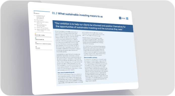 01 01.3 What sustainable investing means to us Principle 1 Introduction 01.1 In conversation with Tobias Pross and Matt Christensen 01.2 About AllianzGI 01.3 What sustainable investing “ Our ambition is to help our clients be informed and position themselves for means to us 01.4 Acting on climate risks the opportunities of sustainable investing and the outcomes they seek.” and opportunities 01.5 Sustainability governance 01.6 Shaping sustainable investing with our clients We are integrating sustainability considerations want to achieve a measurable impact with their across AllianzGI’s offering and accelerating the money which we seek to demonstrate to our clients 02 growth of impact investing as part of our fast-growing with our sustainable investment strategies Sustainable investing private markets offering. We made considerable progress in 2021, developing new sustainable We also engage with the companies in which 03 investment products and innovative analytical we invest on a range of priorities – shaping their Active stewardship tools and methods to aggregate and process data low-carbon transition strategies, mitigating their from third-party providers and alternative data broader environmental impact and enhancing 04 sources, informing our proprietary sustainability governance approaches. AllianzGI as a sustainable business scoring system. To achieve all of this, we built out In our view, this kind of active stewardship is essential, 05 the resources and organisational structure of our because simply divesting from so-called “offenders” Appendix Sustainable and Impact Investing team to advance limits opportunities to drive change. Instead, we our strategy and support data, research and engage with companies to develop constructive stewardship activities. routes to a more sustainable future, recognising that Sustainability is an area filled with innovative and meaningful progress often happens incrementally progressive approaches, but it is also a complex rather than in big, transformative bounds. space where many of the solutions and proof points Climate transition pathways are works in progress, not least due to the evolving One way we are looking to drive real-world impact regulatory landscape and client demand. That is why is through our enhanced climate engagement with we focus first on being a resourceful partner that can high emitting companies highlighted by the launch provide education and thought leadership to our of our Climate Engagement with Outcome approach. clients to help them focus their efforts. We then shape This enables us to use expanding data coverage sustainable pathways for our clients by offering a to fully scope the climate profiles of the highest range of investment options and guidance in public carbon emitters in portfolios and engage more fully and increasingly in private markets with them to identify and develop climate transition New wave of sustainable growth pathways. The most important part of this approach We observe that a large number of our clients are is its real-world impact across all topics, beyond convinced of the necessity and value of investing just carbon emissions. We also gain insights into sustainably. For those ready to make the journey, climate transition efforts across regions and sectors the potential is vast. A wave of sustainable growth which allows us to identify progress of our invested is sweeping the globe, creating significant investable companies in a consistent and comparable way. opportunities. At the same time, investors increasingly Read more on page 32.