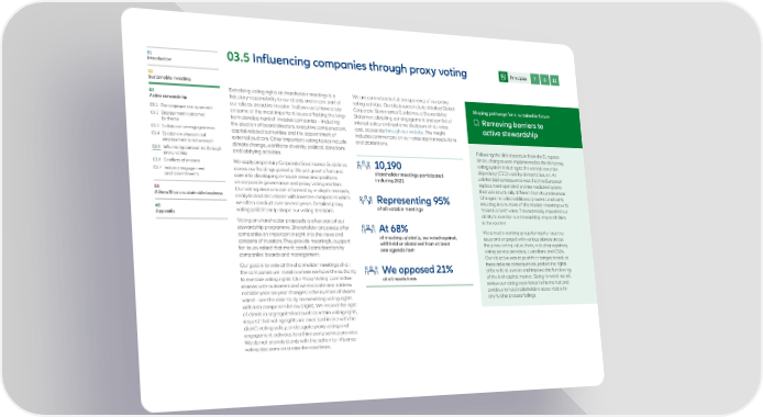 01 03.5 Influencing companies through proxy voting Principles 7 8 12 Introduction 02 Sustainable investing Exercising voting rights at shareholder meetings is a We are committed to full transparency of our proxy- 03 fiduciary responsibility to our clients and a core part of voting activities. Our disclosures include detailed Global Active stewardship our role as an active investor. It allows us to have a say Corporate Governance Guidelines, a Stewardship Shaping pathways for a sustainable future 03.1 Our engagement approach on some of the most important issues affecting the long- Statement detailing our engagement and conflict of Removing barriers to 03.2 Engagement outcomes term development of investee companies – including interest policy and real-time disclosure of all votes by theme the election of board directors, executive compensation, cast, accessible through our website. This insight active stewardship 03.3 Collaborative engagements capital-related authorities and the appointment of includes commentary on our votes against resolutions 03.4 E scalation where initial external auditors. Other important voting topics include and abstentions. engagement is not enough climate change, workforce diversity, political donations Following the UK’s departure from the European 03.5 Influencing companies through and lobbying activities. Union, changes were implemented to the Irish proxy proxy voting voting system including to the central securities 03.6 Conflicts of interest We apply proprietary Corporate Governance Guidelines 10,190 depository (CSD) used by domestic issuers. An 03.7 Industry engagement across our holdings globally. We put great effort and shareholder meetings participated unintended consequence was that the European and commitments care into developing in-house views and positions in during 2021 replacement operated an intermediated system on corporate governance and proxy voting matters. that was structurally different from its predecessor. 04 Our voting decisions are informed by in-depth research, AllianzGI as a sustainable business analysis and discussions with investee companies which Representing 95% Changes included additional process constraints we often conduct over several years. Detailed proxy resulting in a number of shareholder meetings with 05 voting policies help shape our voting decisions. of all votable meetings “shareblocked” votes. This materially impacted our Appendix ability to exercise our stewardship responsibilities Voting on shareholder proposals is a key part of our in the market. stewardship programme. Shareholder proposals offer At 68% We joined a working group formed to raise the companies an important insight into the views and of meetings globally, we voted against, issue and engaged with various players across concerns of investors. They provide meaningful support withheld or abstained from at least the proxy voting value chain, including registrars, for issues raised that merit careful consideration by one agenda item voting service providers, custodians and CSDs. companies’ boards and management. Our objective was to push for changes to reduce Our goal is to vote at the shareholder meetings of all these adverse consequences, protect the rights the companies we invest in where we have the authority We opposed 21% of beneficial owners and improve the functioning to exercise voting rights. Our Proxy Voting Committee of all resolutions of the Irish capital market. Going forward, we will reviews vote outcomes and we evaluate and address review our voting experience in the market and notable year-on-year changes in the number of shares continue to hold stakeholders accountable for voted – see the case study on exercising voting rights any further process failings. with Irish companies below (right). We respect the right of clients in segregated accounts to retain voting rights, request that voting rights are exercised in line with the client’s voting policy, or delegate proxy voting and engagement activities to a third-party service provider. We do not provide clients with the option to influence voting decisions on a case-by-case basis.