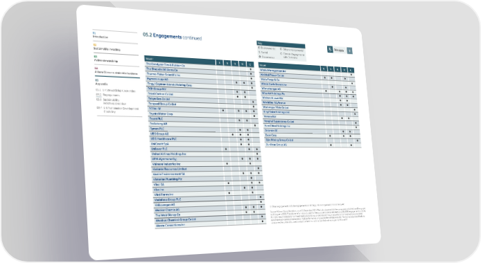 01 05.2 Engagements continued Key Principle 9 Introduction 1 E Environmental O Other engagements S Social C Climate Engagement 02 G Governance with Outcome Sustainable investing 03 Issuer E S G O C Issuer E S G O C Active stewardship The Goodyear Tire & Rubber Co Waste Management Inc 04 The Sherwin-Williams Co Weichai Power Co Ltd AllianzGI as a sustainable business Thermo Fisher Scientific Inc Wells Fargo & Co thyssenkrupp AG Whole Earth Brands Inc 05 Tingyi Cayman Islands Holding Corp Wienerberger AG Appendix TKH Group NV Wizz Air Holdings Plc 05.1 UK Stewardship Code index Tokai Carbon Co Ltd Wolters Kluwer NV 05.2 Engagements Tokyo Gas Co Ltd Worldline SA/France 05.3 Sustainability Tongwei Group Co Ltd Wuliangye Yibin Co Ltd initiatives overview 05.4 U N Sustainable Development TOTAL SE Xinyi Solar Holdings Ltd Goals key Toyota Motor Corp Yandex NV Treatt PLC Yonghui Superstores Co Ltd Trelleborg AB Yum China Holdings Inc Tyman PLC Zalando SE UBS Group AG Zeon Corp UDG Healthcare PLC Zijin Mining Group Co Ltd UniCredit SpA Zur Rose Group AG Unilever PLC United Airlines Holdings Inc UPM-Kymmene Oyj Valmont Industries Inc Vedanta Resources Limited Veolia Environnement SA Victorian Plumbing Plc Vinci SA Visa Inc Vital Farms Inc Vodafone Group PLC Volkswagen AG Wacker Chemie AG 1 Other engagements include engagements on strategy, risk management, transparency etc. The Walt Disney Co Source: Allianz Global Investors, as of 31 December 2021. The lists above exhibit the companies which AllianzGI engaged Wanhua Chemical Group Co Ltd in dialogue in 2021. The above information is used for the purpose to demonstrate AllianzGI’s ESG engagement activities, it is not a recommendation or investment advice to buy or sell any particular securities and should not be considered Waste Connections Inc investment advice/recommendation. Past performance is no guarantee of future results. There is no assurance that any companies/securities discussed are/will be held in any fund/portfolio at managed by AllianzGI.”