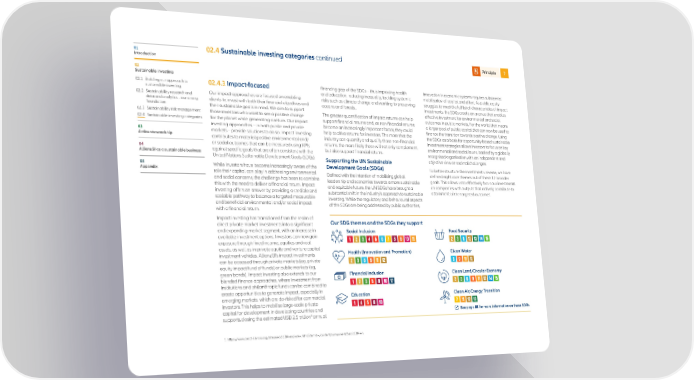 01 02.4 Sustainable investing categories continued Principle 7 Introduction 02 Sustainable investing 02.1 Building our approach to 02.4.3 Impact-focused financing gap of the SDGs – thus improving health innovation in economic systems requires substantial sustainable investing and education, reducing inequality, tackling systemic mobilisation of capital and effort. As public equity 02.2 Sustainability research and Our impact approaches are focused on enabling risks such as climate change and working to preserving struggles to meet the full list of characteristics of impact data and analytics – our strong clients to invest with both their financial objectives and oceans and forests.. investments, the SDGs create an avenue that enables foundation their sustainable goals in mind. We aim to support effective investment for environmental and social 02.3 Sustainability risk management those investors who want to see a positive change The greater quantification of impact returns can help outcomes in public markets. For the world, that means 02.4 Sustainable investing categories for the planet while generating a return. Our impact support financial returns and, as non-financial returns a larger pool of public capital that can now be used to investing approaches – in both public and private become an increasingly important factor, they could finance the transition towards positive change. Using 03 markets – provide solutions to do so. Impact investing help to drive returns for investors. The more that the the SDGs as a basis for opportunity-based sustainable Active stewardship contributes to material positive environmental and/ industry can quantify and qualify those non-financial investment strategies allows investors to focus on key or social outcomes that can be measured using KPIs returns, the more likely these will not only complement, environmental and social issues, backed by a globally 04 against specific goals that are often consistent with the but also support financial returns. recognised organisation with an independent and AllianzGI as a sustainable business United Nations Sustainable Development Goals (SDGs). Supporting the UN Sustainable objective view on societal challenges. 05 While investors have become increasingly aware of the Development Goals (SDGs) To better structure the investment universe, we have Appendix role their capital can play in addressing environmental Defined with the intention of mobilising global defined eight core themes out of these 17 broader and social concerns, the challenge has been to combine leadership and economies towards a more sustainable goals. This allows us to effectively focus our investments this with the need to deliver a financial return. Impact and equitable future, the UN SDGs have brought a on companies with outputs that actively contribute to investing offers an answer by providing a credible and substantial shift in the industry’s approach to sustainable attainment of the targeted outcomes. scalable pathway to balance a targeted measurable investing. While the regulatory and behavioural aspects and beneficial environmental and/or social impact of the SDGs are being addressed by public authorities, with a financial return. Impact investing has transitioned from the realm of Our SDG themes and the SDGs they support direct private-market investments into a significant and expanding market segment, with an increase in Social Inclusion Food Security available investment options. Investors can now gain exposure through fixed income, equities and real assets, as well as in private equity and venture capital Health (Innovation and Promotion) Clean Water investment vehicles. AllianzGI’s impact investments can be accessed through private markets (eg, private equity impact fund of funds) or public markets (eg, green bonds). Impact investing also extends to our Financial Inclusion Clean Land/Circular Economy blended finance approaches, where investment from institutions and philanthropic funds can be combined to create opportunities to generate impact, especially in Education Clean Air/Energy Transition emerging markets, which are de-risked for commercial investors. This helps to mobilise large-scale private capital for development in developing countries and See page 88 for more information on these SDGs 1 supports closing the estimated USD 2.5 trillion annual 1 https://www.oecd-ilibrary.org/sites/6ea613f4-en/index.html?itemId=/content/component/6ea613f4-en.