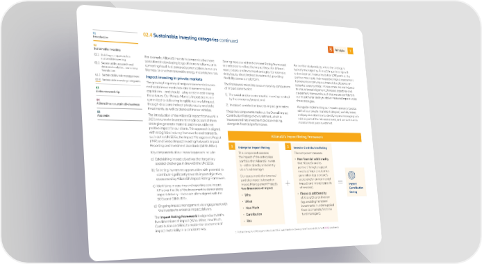 01 02.4 Sustainable investing categories continued Principle 7 Introduction 02 Sustainable investing 02.1 Building our approach to For example, AllianzGI invests in companies that have Scoring modules within the Impact Rating Framework For our blended products, where the strategy is sustainable investing specialised in developing large offshore windfarms, or in are adapted to reflect the impact thesis for different typically managed by AllianzGI in partnership with 02.2 Sustainability research and converting fossil-fuel powered power stations to run on asset classes and investment strategies (for example, a development finance institution (DFI) partner, the data and analytics – our strong biomass, or on other renewable energy materials/sources. debt/equity, direct/indirect investments), providing partner may apply their respective impact assessment foundation flexibility across our platform. frameworks in carrying out impact due diligence on 02.3 Sustainability risk management Impact investing in private markets potential opportunities. In these cases, we work closely 02.4 Sustainable investing categories The growing frequency of major environmental events The Framework takes into account two key components to ensure broad alignment of impact objectives and and social movements has raised awareness that of impact contribution: assessment frameworks, such that we are confident in 03 capital can – and should – play a role in addressing 1) The social and/or environmental impact generated our investments’ ability to deliver material impact under Active stewardship these issues. Our Private Markets Impact teams are by the enterprise/project; and these strategies. 04 committed to delivering tangible real-world impact 2) Investors’ contribution towards impact generation. Alongside implementing our impact approach (and as AllianzGI as a sustainable business through direct and indirect private equity and debt with all our private markets strategies), we fully assess investments, as well as blended-finance vehicles. These two components make up the Overall Impact and pay due attention to identifying and managing ESG 05 The introduction of the AllianzGI Impact framework in Contribution Rating of an investment, which is risks as part of the risk assessment, and we continue to Appendix 2021 ensures the investments made as part of these incorporated into investment decision-making, monitor these post-investment. strategies generate material and measurable net alongside financial performance. positive impact for our clients. This approach is aligned with recognised industry frameworks and standards, AllianzGI’s Impact Rating Framework such as the UN SDGs, the Impact Management Project (IMP) and Global Impact Investing Network’s Impact Reporting and Investment Standards (GIIN’s IRIS+). 1 Enterprise Impact Rating 2 Investor Contribution Rating Key components of our impact approach include: This component assesses This component assesses: a) Establishing impact objectives that target key the impact of the enterprise/ • Non-financial additionality societal challenges in line with the UN SDGs. portfolio that AllianzGI invests that AllianzGI and its in – either directly or indirectly partners1 bring to support b) Selecting investment opportunities with potential to via a fund manager. investees’ impact outcomes contribute significantly towards impact objectives, Our assessment of enterprise/ generation (eg, a project’s as assessed by AllianzGI’s Impact Rating Framework. portfolio impact is based on social and/or environmental c) Identifying, measuring and reporting core impact Impact Management Project’s impact) and impact capacity Impact KPIs over the life of the investment to demonstrate five dimensions of impact of investee). Contribution impact delivery – these are often aligned with the • Who • Financial additionality Rating SDGs and GIIN’s IRIS+. of AllianzGI as an investor d) Ongoing impact management via engagement with • What (eg, enabling increased the investee to enhance impact delivery. • How Much investments in undersupplied The Impact Rating Framework is aligned with IMP’s • Contribution financial markets/first time five dimensions of impact (Who, What, How Much, fund managers). Contribution and Risk) to enable the assessment of • Risk impact materiality in a consistent way. 1 Partners being Fund Managers in the cases of FoF investments and Development Finance Institutions of [XXX] investments