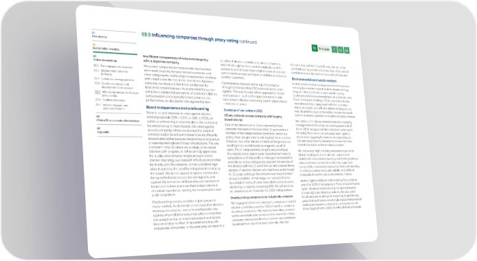 01 03.5 Influencing companies through proxy voting continued Principles 7 11 12 Introduction 02 Sustainable investing Insufficient transparency of remuneration policy scrutinised director commitments where companies believed that, with the Covid-19 crisis, the risk of the 03 with a Japanese company were hit strongly by the economic implications of the candidate being overstretched was high. After careful Active stewardship pandemic and directors had a high number of external consideration we decided not to support the election. 03.1 Our engagement approach We expect companies to transparently disclose their commitments or were serving in an additional executive 03.2 Engagement outcomes remuneration policy, targets and achievements, and position elsewhere. Environmental and social matters by theme other components, and to align compensation practices In 2021, for the first time, companies tabled resolutions 03.3 Collaborative engagements with shareholder interest. In the case of one Japanese Concentration of power at the top of a company seeking shareholder consent on their climate strategy 03.4 E scalation where initial company, we observed that it did not disclose the through combined chair/CEO roles also led to votes (Say on Climate). We developed specific voting engagement is not enough level of retirement bonuses. As a retirement bonus can against. This was the case where appropriate checks guidelines and reviewed resolutions on a case-by-case 03.5 Influencing companies through comprise a substantial proportion of a director’s lifetime and balances – such as the appointment of a lead basis for material holdings. Often, our voting decisio proxy voting compensation and is typically linked to tenure, not independent director and strong board independence was preceded by engagement with the company, 03.6 Conflicts of interest performance, we decided to vote against the item. – were not in place. where we sought to clarify the climate strategy put to 03.7 Industry engagement Board independence and overboarding Examples of our voting in 2021 vote, its ambition level and whether companies would and commitments commit to annual updates for investors to judge progress. Despite a slight decrease in votes against director- US educational services company with lengthy 04 related proposals (23% in 2021 vs. 26% in 2020), we board tenures We voted on 31 climate-related resolutions raised by AllianzGI as a sustainable business continue to have major concerns about the sound and One of the directors of a US educational services management of 30 companies and supported all of balanced set-up of many boards. We voted against company has been on the board for 13 years and is a them. While we gave certain companies some credit 05 several companies where we deemed the board of member of the compensation committee. Under our for being first movers, we will apply more rigorous Appendix directors and/or board committees to be insufficiently benchmarking going forward as we expect Say on independent, either because directors had a long tenure policy, these are grounds to vote against his re-election. However, four other directors had much longer tenures Climate resolutions to become more prevalent and or were representatives of major shareholders. This was resulting in an overall board average tenure of 14 market standards on these votes to evolve. a concern in the US where we routinely come across years. This is inappropriately lengthy and prioritised directors with long tenure. While we fully appreciate We encourage high-emitting companies to put their the quality and company insight an experienced the need to encourage broader board refreshment. In climate strategy to a vote and we supported all director may bring, our approach reflects a concern that consultation with the portfolio manager, we decided to shareholder resolutions requesting non-binding advisory familiarity with the company can be a disadvantage override our proxy voting policy, support the election of votes on climate action plans. We also supported when it comes to the need for independent scrutiny by the director with the 13 years’ tenure, and oppose the re- almost 80% of proposals requesting improved reporting the board. We do not oppose long-tenured directors election of another director who had been on the board on climate change and sustainability, and 100% of being on the board as such, but we regularly vote for 20 years, although that director was not a member proposals on community environmental impact. against the re-election of those who are members of of any committee. At this stage, our view is reflected board committees where we think independence is by a small minority of votes since all the directors were Human rights continued to be a strong focus and we of utmost importance, namely the compensation and elected by a majority exceeding 90%. We will reassess voted for 100% of all proposals. These included human audit committees. our position as we head into the 2022 voting season. rights risk assessments and improving a company’s human rights standards or policies. We also voted Overboarding remains another major concern in Overboarding concerns at an industrials company for all resolutions asking for reporting on gender pay many markets. As demands on non-executive directors We engaged a German industrials company on board gaps. As in past years, we strongly supported proposals increase, we voice our concerns and typically vote elections and discussed the CEO of another company seeking transparency of political contributions and against when full-time executives take on more than standing for election. We had overboarding concerns lobbying payments, voting for 94% of these proposals. one executive role, or when non-executive directors as the candidate also served on the board of a Swiss take on a large number of appointments in public company and we would only allow for one additional and private companies. In the 