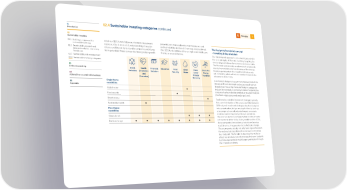 01 02.4 Sustainable investing categories continued Principle 7 Introduction 02 Sustainable investing 02.1 Building our approach to All of our SDG funds follow our thematic investment potential, are more resilient to macroeconomic and sustainable investing approach, built on a solid understanding of secular political volatility and benefit from regulatory tailwinds. The footprint/handprint concept 02.2 Sustainability research and drivers and the ability to identify companies with long- Our SDG funds address either a single sustainable core –investing in key enablers data and analytics – our strong term potential. These companies have greater growth theme, or several themes. Our listed impact approach uses a model grounded in foundation 02.3 Sustainability risk management the core principles of thematic investing, targeting the 02.4 Sustainable investing categories structural growth driven by economic and social shifts. The thematic view provides an alternative framework to 03 identify key enablers and beneficiaries of the change. Active stewardship Social Health Financial Education Food Clean Clean Clean Air/ Investors participate in the investments that society Inclusion (Innovation Inclusion Security Water Land/ Energy will commit to, which will in turn contribute towards the 04 and Circular Transition attainment of the SDGs. AllianzGI as a sustainable business Promotion) Economy Single theme A company’s footprint is a common measurement of the 05 capabilities impact on the environment and society resulting from Appendix its activities. Frequently measured footprint categories Global water include, for example, a company’s carbon footprint (the Food security amount of carbon dioxide emitted) or its water footprint (the fresh water consumed and/or polluted). Smart energy Traditional sustainable investment strategies typically Sustainable health focus on minimisation of the overall portfolio footprint. SDG-aligned investment strategies also take footprint Main theme into consideration, but go one step further by looking capabilities at a company’s overall potential impact on society Clean planet and environment beyond just its own operations. The aim is to invest in companies that contribute to the Positive change achievement of the SDGs. As key enablers of the SDGs, these companies’ innovations, products and services result in a much larger potential to facilitate change. Those companies ideally not only have a good footprint themselves, but also allow others to lower or minimise their footprint. The handprint describes this multiplier effect: key enablers not only manage their own footprint but have a potentially much larger contribution through their impact on others.