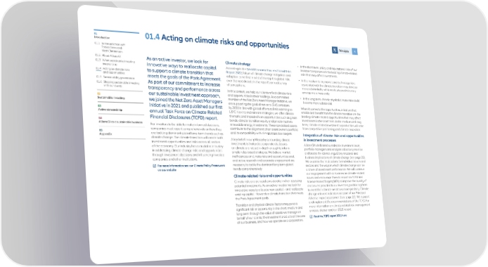 01 01.4 Acting on climate risks and opportunities Principle 4 Introduction 01.1 In conversation with Tobias Pross and Matt Christensen 01.2 About AllianzGI As an active investor, we look for Climate strategy • In the short term, policy and reputational risks of our 01.3 W hat sustainable investing innovative ways to reallocate capital According to the World Economic Forum’s Global Risks investee companies are the leading climate-related means to us Report 2022, failure of climate change mitigation and risks that may affect investments. 01.4 Acting on climate risks to support a climate transition that adaption come first in a list of the top ten global risks • In the medium term, market and technology risks and opportunities meets the goals of the Paris Agreement. over the next decade in the report’s annual survey 01.5 Sustainability governance associated with the climate transition may develop 01.6 Shaping sustainable investing As part of our commitment to increase of perceptions. more substantially, while acute physical risks may with our clients transparency and performance across In this context, we help our clients reflect climate risks emerge more frequently. our sustainable investment approach, and opportunities in their holdings. As a committed • In the long term, chronic physical climate risks could 02 member of the Net Zero Asset Manager initiative, we become more substantial. Sustainable investing we joined the Net Zero Asset Managers are supporting the goal of net-zero GHG emissions initiative in 2021 and published our first by 2050 in line with global efforts to limit warming to When it comes to the opportunities, initiatives that 03 1.5°C. Next to mainstream strategies, we offer climate enable and benefit from the climate transition are the Active stewardship annual Task Force on Climate-Related leading climate-related opportunities that may affect Financial Disclosures (TCFD) report. thematic and impact-driven opportunities such as green investments in the short term. In the medium and long 04 bonds, climate transition equity and private markets term, climate-related investment opportunities will arise AllianzGI as a sustainable business For investors to be able to make informed decisions, renewable energy investments. These specialised assets companies must report comprehensively on how they contribute to the alignment of an asset owner’s portfolio from competitive positioning and climate innovation. 05 are tackling dominant global long-term trends such as and its compatibility with climate transition targets. Integration of climate risks and opportunities Appendix climate change. The climate transition will create both investment opportunities and risks across all sectors A key belief in our philosophy surrounding climate in investment processes of the economy. Our industry has a crucial role to play investments is that public corporate disclosures AllianzGI’s dedicated sustainable investment team, in addressing climate change risks and opportunities on climate are not yet in-depth enough to inform portfolio managers and analysts collectively monitor through investment decisions and influencing investee simple rules-based strategies. We believe market and assess the science, regulatory response and companies and other institutions. inefficiencies on climate risks and opportunities exist, business implications of climate change (see page 22). and active research and corporate engagement are We examine the implications for individual issuers and For more information see our Climate Policy Framework necessary to tackle the dominant long-term global sectors and the ways in which climate change can be on our website trends comprehensively. a driver of investment performance. We will continue Climate-related risks and opportunities our engagement with companies on climate-related Climate risks are a crucial consideration when assessing issues and encourage them to report on TCFD and potential investments. As an active investor, we look for Science Based Targets(SBTs) to improve the quality of innovative ways to allocate new capital – and reallocate disclosures provided to our investors, positioning them existing capital – towards a climate transition that meets to meet their climate ambitions more precisely. Climate the Paris Agreement goals. change-relevant indicators are part of our Principal Adverse Impact assessment (see page 22). We support Transition and physical climate factors may pose a and implement the recommendations of the TCFD. For significant risk or opportunity in the short, medium and more information on climate-related risk management long term through the value of assets we manage on process, please read our 2021 report. behalf of our clients, the investment products at the core Read the TCFD report 2021 here of our business, and how we operate as a corporation.