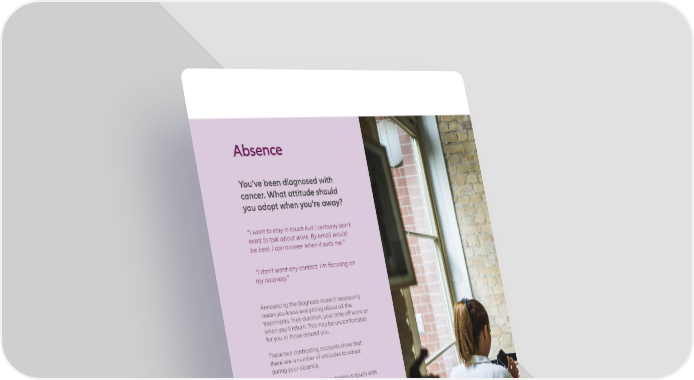 Absence You’ve been diagnosed with cancer. What attitude should you adopt when you’re away? “I want to stay in touch but I certainly don’t want to talk about work. By email would be best. I can answer when it suits me.” “I don’t want any contact. I’m focusing on my recovery.” Announcing the diagnosis doesn’t necessarily mean you know everything about all the treatments, their duration, your time off work or when you’ll return. This may be uncomfortable for you or those around you. These two contrasting accounts show that there are a number of attitudes to adopt during your absence. It is important to consider staying in touch with your professional circle, but ultimately you decide whether or not to do so, how to do so (SMS, email, telephone), and how often. It seems important not to break off contact, since you’re still part of the team. Being aware that there’s still a place for you can lend moral support. In addition, keeping in touch during your absence makes it easier to return. 8