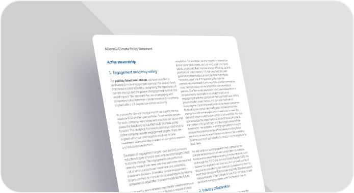 Active stewardship 1. Engagement and proxy voting For publicly listed asset classes , we have launched a dedicated climate engagement approach for several funds that invest in listed securities, recognising the importance of climate change and the power of engagement to drive real- world impact. This approach focuses on engaging with companies to facilitate their climate transition to a pathway aligned with a 1.5 degree low-carbon economy. As a proxy for climate change impact, we identify the top absolute CO2 emitters per portfolio. To set realistic targets for each company, we analyse best practices per sector and assess the feasible progress that could be made going forward. This analytical framework provides a solid basis to define company-specific engagement targets. These are aligned within our listed equities and fixed income investment teams and documented on our global research and collaboration platform. Examples of engagement targets could be GHG emissions reduction targets or board-level remuneration targets linked to climate change. The engagements are performed centrally, tracked over time, and their outcomes are reported – all of which supports our investment and, potentially, divestment decisions. Ultimately, climate engagement targets can help to improve risk-adjusted returns by helping companies to adjust their business models for the future. Additionally, environmental and climate considerations are reflected in our proxy voting activities in respect of listed equity assets. Our voting records on climate-related shareholder resolutions demonstrate strong support for such resolutions, encouraging companies to pursue the transition to decarbonisation. For private market asset classes , we typically have direct access to the management of our investee companies. Our private market assets often play a significant role in the capital structure of investee companies, and this enables a level of engagement that may generate improvements in ESG practices, such as by encouraging them to implement climate transition/resilient measures. A considerable proportion of our private market assets under management are invested in real assets, such as infrastructure. By nature, real and infrastructure assets can have a significant impact (positive or negative) on climate transition. Using the EU Taxonomy as reference is helpful for quantifying the contribution of our real asset and infrastructure investments to climate change mitigation and adaptation. For example, we are invested in renewable power-generation assets, such as wind, solar and hydro plants, and assets that improve energy efficiency, such as portfolios of smart meters. It is our view that a power- generation asset fuelled (in part) by fossil fuels faces “stranded asset” risk if its operating life could be prematurely shortened due to regulatory carbon emissions caps, heavy taxation or an alternative climate-related penalty. Our firm-wide approach is that we believe there is an opportunity to enable the climate transition via engagement with the companies that use fossil fuels. Within private market asset classes, this can take the form of financing the capital expenditure to allow these companies to develop low-carbon technologies and rebalance their energy mix with some exposure to fossil fuels to meet the demand when a substitution option is not available. We also acknowledge the importance of evaluating a company in the context of its jurisdiction and the target impact of the investment – for instance, in emerging markets it is key to analyse the potential trade-off between providing basic electricity access to a certain population and the possibility that the source of such electricity results in some exposure to fossil fuels. We will continue our engagement with companies on climate-related issues and encourage them to increase transparency reporting on leading climate initiatives, such as through the TCFD and Science Based Targets (SBT). We believe this approach will also lead to improved quality of disclosures provided to our investors by positioning them to meet their climate ambition more precisely. We also support and participate in the Climate Action 100+ initiative, as well as collective engagements with The Investor Forum. 2. Industry collaboration As a part of our support for TCFD, we recognise the necessity for a broader change and alignment in the investment industry around climate risks and opportunities. We believe that this can bring several long-term benefits to our investors. These include more attention and efforts from investee companies due to more aligned climate expectations, more precise measurement through clear requirements on climate scenarios that meet investor needs, and more refined climate investment frameworks. We have been an active member of the Paris Aligned Investment Initiative, launched by the Institutional Investors Group on Climate Change (IIGCC) to bring together some of the world’s largest asset owners and asset managers for the development of a “Net Zero Investment Framework”. For a full list of our climate-related memberships, see Appendix. AllianzGI Climate Policy Statement 6
