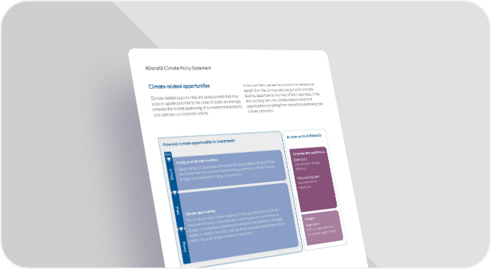 Climate-related opportunities Climate-related opportunities are developments that may pose an upside potential to the value of assets we manage, enhance the market positioning of our investment products, and optimise our corporate activity. In the short term, we see the activities that enable and benefit from the climate and energy transition as the leading opportunities that may affect investments. In the mid and long term, the climate-related investment opportunities are arising from competitive positioning and climate innovation. Potential climate opportunities in investments In other parts of AllianzGI Energy and climate transition Opportunities for businesses and economies that enable and benefit from the climate transition towards cleaner energy generation, efficient energy storage, and sustainable energy consumption. Climate opportunities The climate transition and emergence of more prevalent physical climate risks is likely to bring a transformation unlocking new sources of revenue, change in competitive positioning of businesses and economies, emerging leaders in climate innovation, and significant reputation advantages, all of which may result in opportunities in investments. Corporate and operational Short term: cost savings in energy efficiency Mid and long term: improved brand reputation Product Short term: shift in market demand for climate opportunities Term Mid Long Short AllianzGI Climate Policy Statement 4