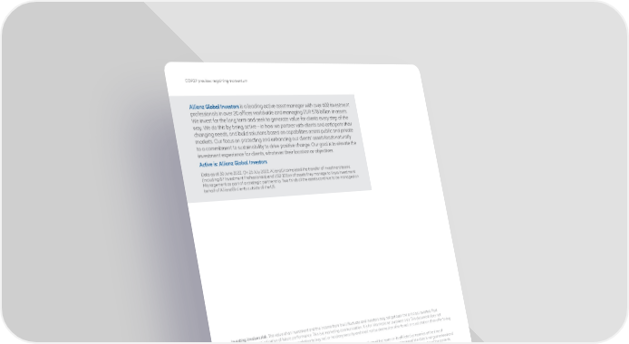 COP27 preview: regaining momentum Allianz Global Investors is a leading active asset manager with over 600 investment professionals in over 20 offices worldwide and managing EUR 578 billion in assets. We invest for the long term and seek to generate value for clients every step of the way. We do this by being active – in how we partner with clients and anticipate their changing needs, and build solutions based on capabilities across public and private markets. Our focus on protecting and enhancing our clients’ assets leads naturally to a commitment to sustainability to drive positive change. Our goal is to elevate the investment experience for clients, whatever their location or objectives. Active is: Allianz Global Investors Data as at 30 June 2022. On 25 July 2022, AllianzGI completed the transfer of investment teams (including 87 Investment Professionals) and USD 101bn of assets they manage to Voya Investment Management as part of a strategic partnership. Two thirds of the assets continue to be managed on behalf of AllianzGI clients outside of the US. Investing involves risk. The value of an investment and the income from it will fluctuate and investors may not get back the principal invested. Past performance is not indicative of future performance. This is a marketing communication. It is for informational purposes only. This document does not constitute investment advice or a recommendation to buy, sell or hold any security and shall not be deemed an offer to sell or a solicitation of an offer to buy any security. The views and opinions expressed herein, which are subject to change without notice, are those of the issuer or its affiliated companies at the time of publication. Certain data used are derived from various sources believed to be reliable, but the accuracy or completeness of the data is not guaranteed and no liability is assumed for any direct or consequential losses arising from their use. The duplication, publication, extraction or transmission of the contents, irrespective of the form, is not permitted. This material has not been reviewed by any regulatory authorities. In mainland China, it is for Qualified Domestic Institutional Investors scheme pursuant to applicable rules and regulations and is for information purpose only. This document does not constitute a public offer by virtue of Act Number 26.831 of the Argentine Republic and General Resolution No. 622/2013 of the NSC. This communication’s sole purpose is to inform and does not under any circumstance constitute promotion or publicity of Allianz Global Investors products and/or services in Colombia or to Colombian residents pursuant to part 4 of Decree 2555 of 2010. This communication does not in any way aim to directly or indirectly initiate the purchase of a product or the provision of a service offered by Allianz Global Investors. Via reception of his document, each resident in Colombia acknowledges and accepts to have contacted Allianz Global Investors via their own initiative and that the communication under no circumstances does not arise from any promotional or marketing activities carried out by Allianz Global Investors. Colombian residents accept that accessing any type of social network page of Allianz Global Investors is done under their own responsibility and initiative and are aware that they may access specific information on the products and services of Allianz Global Investors. This communication is strictly private and confidential and may not be reproduced. This communication does not constitute a public offer of securities in Colombia pursuant to the public offer regulation set forth in Decree 2555 of 2010. This communication and the information provided herein should not be considered a solicitation or an offer by Allianz Global Investors or its affiliates to provide any financial products in Brazil, Panama, Peru, and Uruguay. In Australia, this material is presented by Allianz Global Investors Asia Pacific Limited (“AllianzGI AP”) and is intended for the use of investment consultants and other institutional/professional investors only, and is not directed to the public or individual retail investors. AllianzGI AP is not licensed to provide financial services to retail clients in Australia. AllianzGI AP is exempt from the requirement to hold an Australian Foreign Financial Service License under the Corporations Act 2001 (Cth) pursuant to ASIC Class Order (CO 03/1103) with respect to the provision of financial services to wholesale clients only. AllianzGI AP is licensed and regulated by Hong Kong Securities and Futures Commission under Hong Kong laws, which differ from Australian laws. This document is being distributed by the following Allianz Global Investors companies: Allianz Global Investors U.S. LLC, an investment adviser registered with the U.S. Securities and Exchange Commission; Allianz Global Investors Distributors LLC, distributor registered with FINRA, is affiliated with Allianz Global Investors U.S. LLC; Allianz Global Investors GmbH, an investment company in Germany, authorized by the German Bundesanstalt für Finanzdienstleistungsaufsicht (BaFin); Allianz Global Investors (Schweiz) AG; in HK, by Allianz Global Investors Asia Pacific Ltd., licensed by the Hong Kong Securities and Futures Commission; ; in Singapore, by Allianz Global Investors Singapore Ltd., regulated by the Monetary Authority of Singapore [Company Registration No. 199907169Z]; in Japan, by Allianz Global Investors Japan Co., Ltd., registered in Japan as a Financial Instruments Business Operator [Registered No. The Director of Kanto Local Finance Bureau (Financial Instruments Business Operator), No. 424], Member of Japan Investment Advisers Association, the Investment Trust Association, Japan and Type II Financial Instruments Firms Association; in Taiwan, by Allianz Global Investors Taiwan Ltd., licensed by Financial Supervisory Commission in Taiwan; and in Indonesia, by PT. Allianz Global Investors A