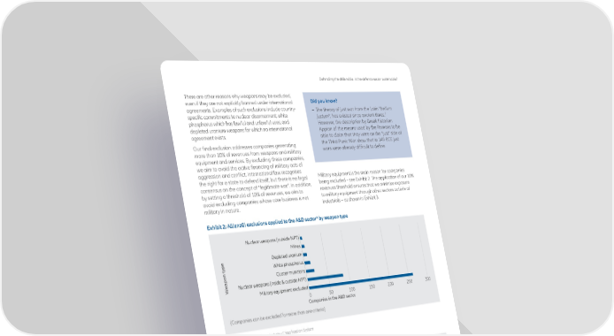 Defending the defensible: is the defence sector sustainable? There are other reasons why weapons may be excluded, even if they are not explicitly banned under international Did you know? agreements. Examples of such exclusions include country- – The theory of just war from the Latin “bellum specific commitments to nuclear disarmament; white 7 justum”, has existed since ancient times. phosphorus which has lawful and unlawful uses; and However, the description by Greek historian depleted uranium weapons for which no international Appian of the means used by the Romans to be agreement exists. able to claim that they were on the “just” side of Our final exclusion addresses companies generating the Third Punic War show that in 149 BCE just more than 10% of revenues from weapons and military wars were already difficult to define. equipment and services. By excluding these companies, we aim to avoid the active financing of military acts of aggression and conflict. International law recognises the right for a state to defend itself, but there is no legal Military equipment is the main reason for companies consensus on the concept of “legitimate war”. In addition, being excluded – see Exhibit 2. The application of our 10% by setting a threshold of 10% of revenues, we aim to revenues threshold ensures that we minimise exposure avoid excluding companies whose core business is not to military equipment through other sectors outside of military in nature. industrials – as shown in Exhibit 3. Exhibit 2: AllianzGI exclusions applied to the A&D sector* by weapon type Nuclear weapons (outside NPT) ines epleted uranium hite phosphorus Cluster munitions Weapon typeNuclear weapons (inside outside NPT) ilitar euipment excluded 0 50 100 150 200 250 300 Companies in the A&D sector (Companies can be excluded for more than one criteria) *Based on the Bloomberg Industry Classification System Source: Allianz Global Investors internal data Exhibit 3: AllianzGI’s 10% threshold minimises investor exposure to weapons Companies by sector* flagged by AllianzGI’s exclusion policy for military equipment but non-excluded (itin tresold Go‚ernment ƒi‚ersified …tilities †nergy Consumer‡ ˆon-cyclical Industrial (A‰ƒ Šinancial ‹asic Œaterials Companies by sectorCommunications Žecnology Consumer‡ Cyclical Industrial (ˆon-A‰ƒ € Companies in the A&D sector *Bloomberg Industry Classification System Source: Allianz Global Investors internal data 3