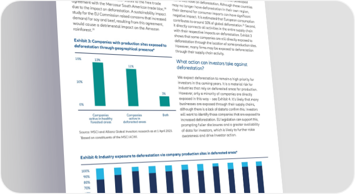 DEFORESTATION: GETTING TO THE ROOT OF THE PROBLEM Deforestation as a political topic The EU is also in the process of adopting regulation which addresses deforestation in supply chains. This will require Political momentum to end deforestation was evident companies selling products in the common market to ensure 16 at the COP 27 climate conference and later at its that goods or their components/ingredients are not the biodiversity equivalent COP 15, which included an result of deforestation. They will also need to consider their 20 agreement to protect at least 30% of the world’s oceans supply chain’s contribution to deforestation. This regulation by 2030.17 Such high-level e昀昀orts are already having an is an important step forward for two reasons. First, it impact on awareness of deforestation and are driving formally recognises the indirect impact that developed positive action. One example is opposition from several economies have on deforestation. Although these countries European Union (EU) member states to the free trade may no longer have deforestation in their own region, 18 agreement with the Mercosur South American trade bloc, their demand for consumer imports can have signi昀椀cant due to the impact on deforestation. A sustainability impact negative impact. It is estimated that European consumption study for the EU Commission raised concerns that increased contributes to around 10% of global deforestation.21 Second, demand for soy and beef, resulting from this agreement, it directly connects all activities in the entire supply chain would cause a detrimental impact on the Amazon with their respective impacts on deforestation. Exhibit 3 19 rainforest. shows that some companies are still directly exposed to deforestation through the location of some production sites. Exhibit 3: Companies with production sites exposed to However, many 昀椀rms may be exposed to deforestation deforestation through geographical presence* through their supply chain activity. 15% 13% What action can investors take against 11% deforestation? We expect deforestation to remain a high priority for 10% investors in the coming years. It is a material risk for industries that rely on deforested areas for production. 3% However, only a minority of companies are directly exposed in this way – see Exhibit 4. It’s likely that many 0% businesses are exposed through their supply chains, although there is a lack of data to con昀椀rm this. Investors Companies Companies Both will want to identify those companies that are exposed to active in healthy active in increased deforestation. EU legislation can support this, forested areas deforested areas prompting fuller disclosures and a greater availability Source: MSCI and Allianz Global Investors research as at 1 April 2023. of data for investors, which is likely to further raise * Based on constituents of the MSCI ACWI. awareness and drive investor action. Exhibit 4: Industry exposure to deforestation via company production sites in deforested areas* 100% 90% 80% 70% 60% 50% 40% 30% 20% 10% 0% Industrials Information Financials Materials Consumer Consumer Real Health Energy Utilities Communications technology discretionary staples estate care services No direct exposure to deforestation Direct exposure to deforestation Source: MSCI and Allianz Global Investors research as at 1 April 2023. * Based on constituents of the MSCI ACWI. 4