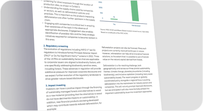 DEFORESTATION: GETTING TO THE ROOT OF THE PROBLEM We have identi昀椀ed three ways for investors to address Exhibit 5: Number of companies with a deforestation deforestation in their investment approaches: policy* 1. Identifying deforestation risk materiality 3000 For investors, it will be important to identify companies that are exposed to deforestation – whether directly or 2500 2432 indirectly – alongside how much risk exists in the sector they are operating within. Di昀昀erent approaches to 2000 identifying risks include: 1500 • Screening for direct exposure through the location of production sites, as shown in Exhibit 3. 1000 • Understanding the supply chains used by companies 500 or sectors, as well as deforestation policies and 74 practices. This is important as the products impacting 0 deforestation are often further upstream in the supply chain. Yes Not disclosed • Engaging with companies is a critical tool in ensuring their awareness of the topic in the absence of Source: MSCI ACWI and Allianz Global Investors research as at 1 April 2023. appropriate disclosures. Engagement also enables *Based on constituents of the MSCI ACWI. identi昀椀cation of possible risks and the likely strategic initiatives required for companies to become resilient in this area. 2. Regulatory screening Reforestation projects can also be financed. Many such 22 The evolution of regulations including MiFID II led EU projects are currently more philanthropic in nature. regulators to introduce formal Principal Adverse Impact However, reforestation can help drive innovative financial 23 24 (PAI) or Do No Signi昀椀cant Harm, screens in 2022. Three solutions, to the extent that it is possible to put a financial of the 14 PAIs on sustainability factors that are applicable value on the natural capital derived from forests. to corporate issuers are aligned to biodiversity factors, with one speci昀椀cally addressing biodiversity sensitive areas, Deforestation is a far-reaching challenge, both including forests. These advances in regulation will provide geographically and across our three pivotal sustainability additional pressure for improved corporate disclosures and themes: climate change, planetary boundaries (including we expect further evolution of the regulatory landscape to biodiversity), and inclusive capitalism (including many social drive greater nature-based disclosures. sustainability issues). The recent progress on globally coordinated policy alongside a regional focus is pushing 3. Impact investing deforestation into the mainstream for industry sectors and Investors can have a positive impact through the 昀椀nancing companies. This will not only prompt improved disclosures, of sustainably managed forests and alternatives to wood but we anticipate it will also more formally embed this as a raw material (providing that the alternatives to wood important sustainability issue into investment approaches. do not have detrimental impacts on sustainability). In addition, new 昀椀nancial products are being developed which may contribute towards reduced deforestation, for example: • Carbon credits from sustainable forests. Re昀椀nement is needed on the scope, structure and governance of these instruments, alongside the long-term protection of these assets.25 26 • Forest bonds and other speci昀椀c instruments. As above, consensus on principles and approaches will be needed to accelerate adoption. 5
